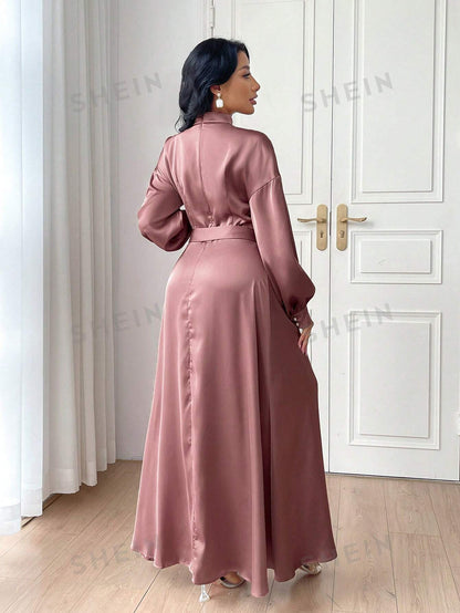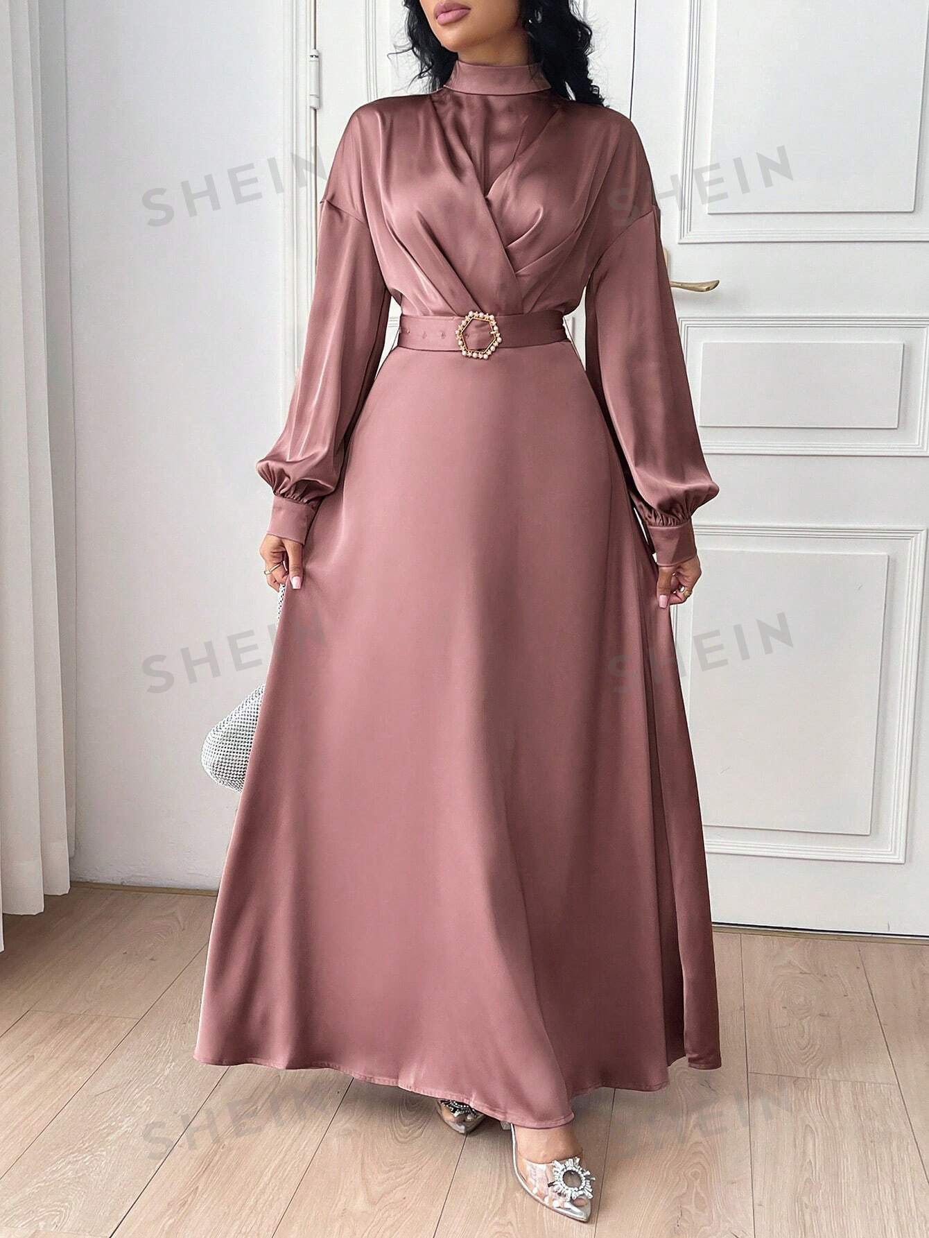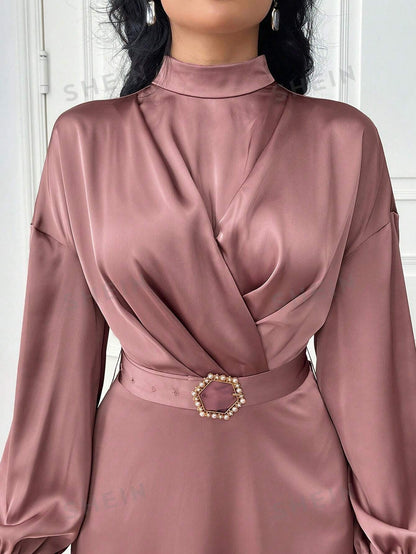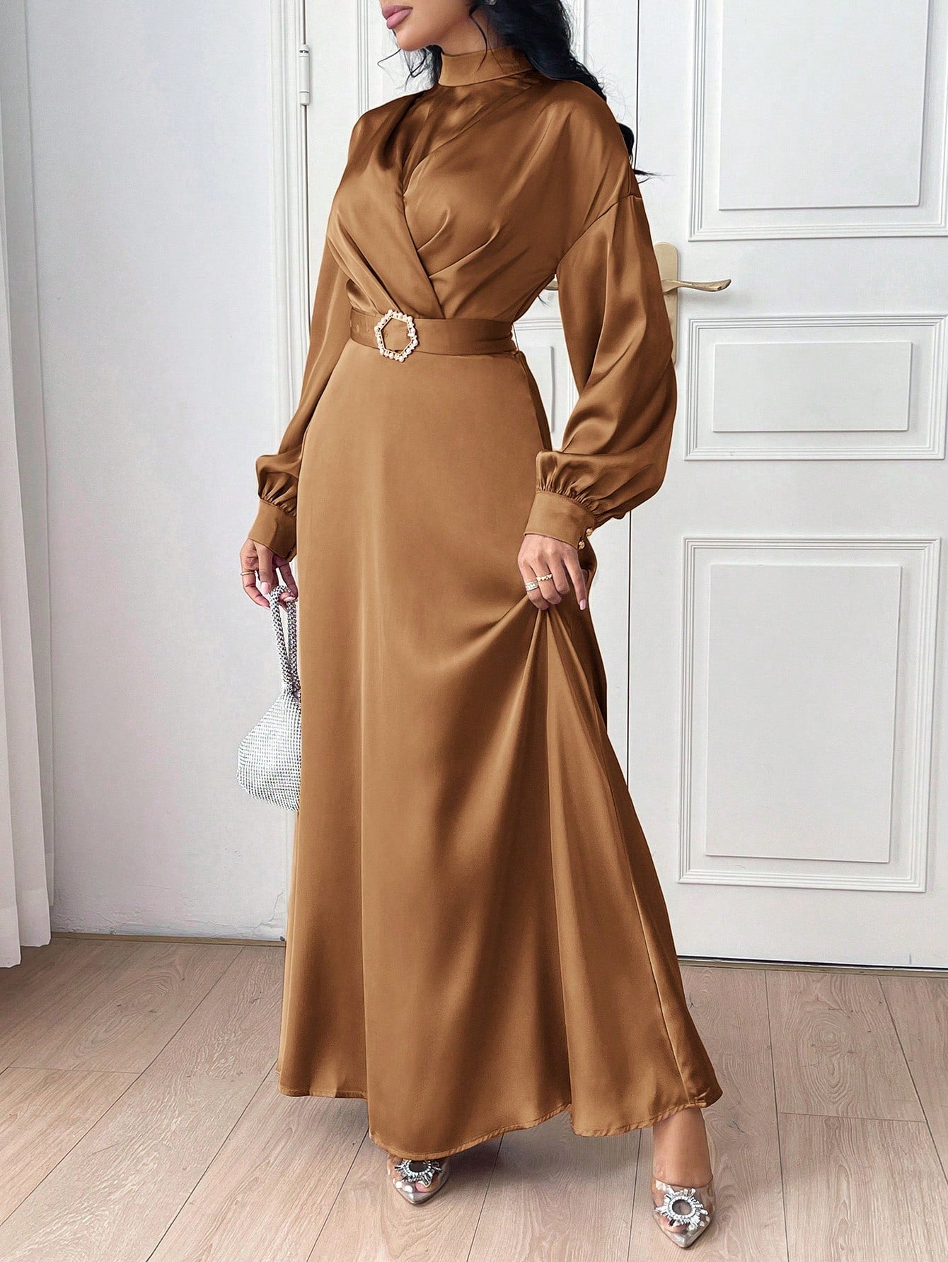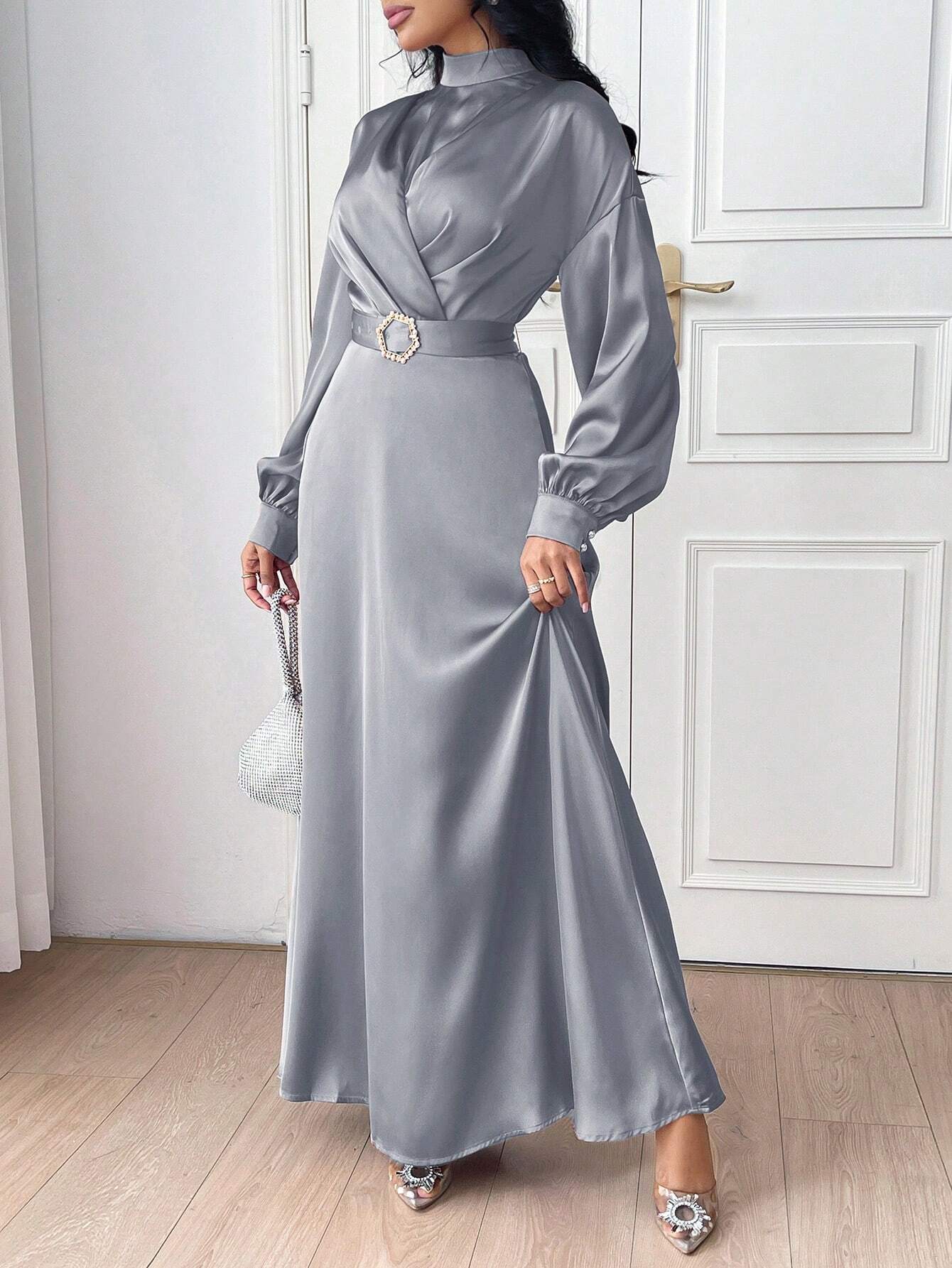 Modely Women Elegant Solid Color Lantern Sleeve Buckle Waist Dress,Elegant Evening Party Maxi Dress