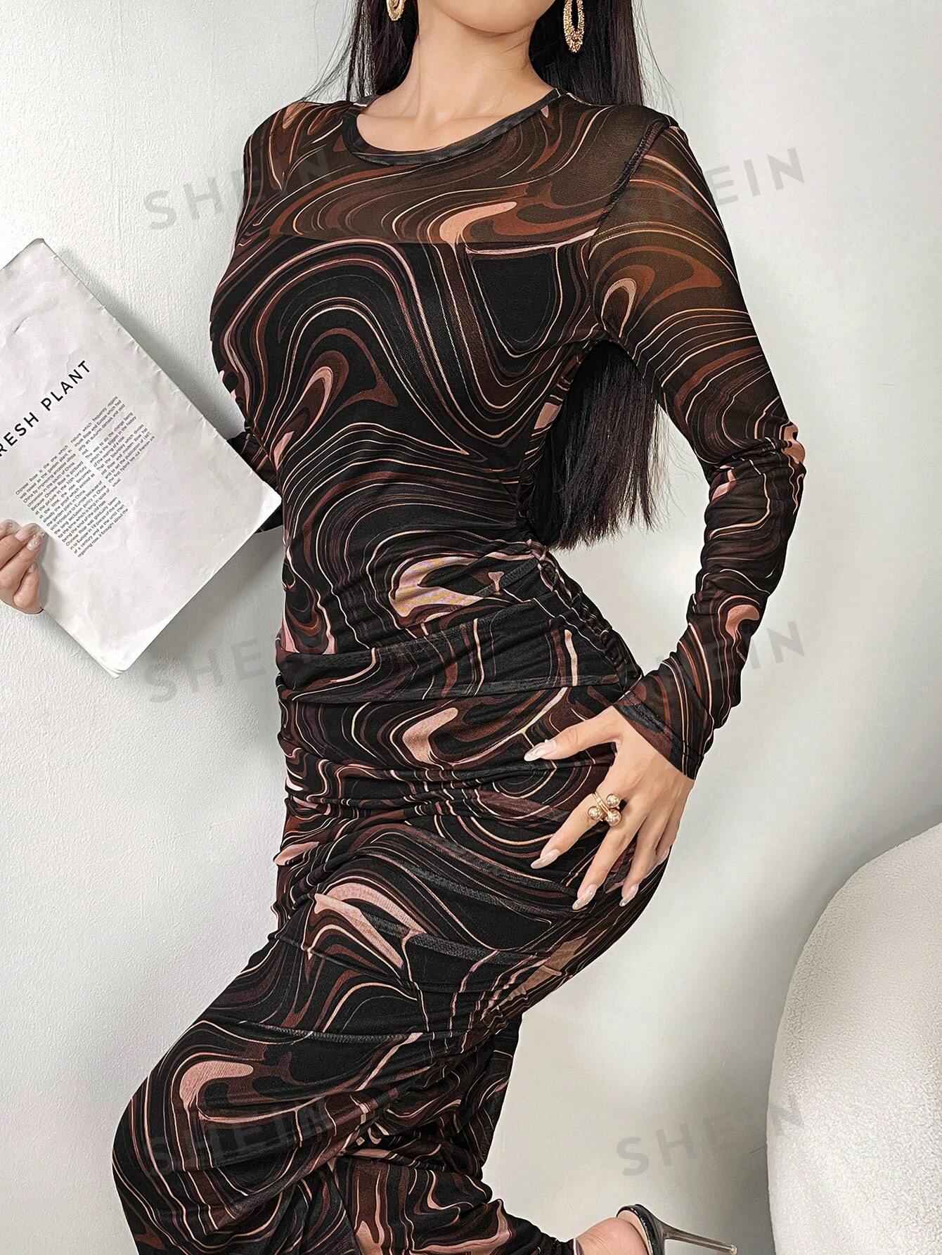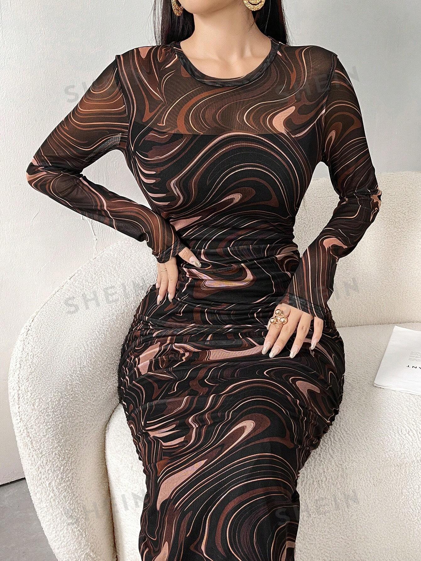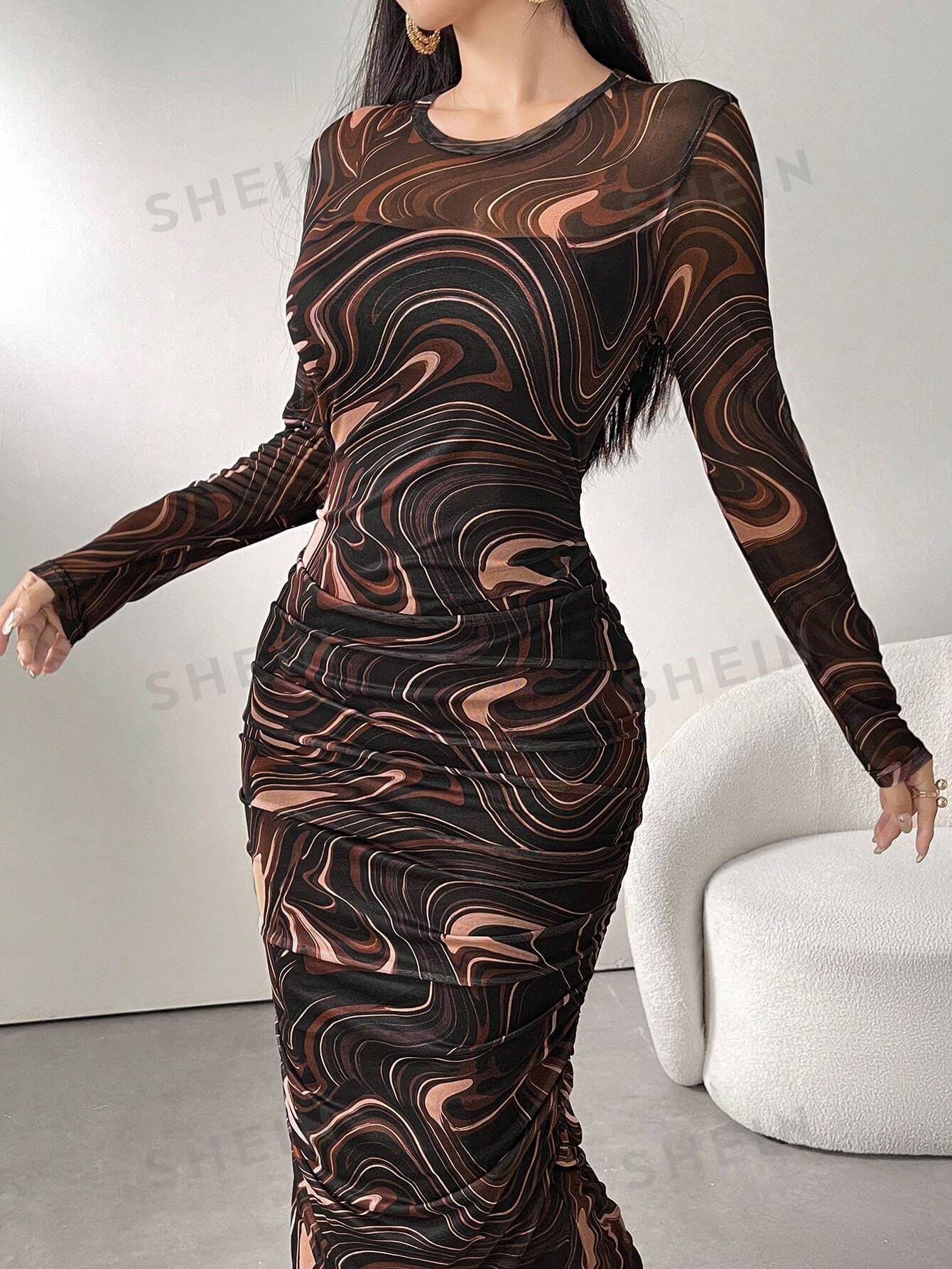 Modely Women Round Neck Long Sleeve Fitted Patterned Elegant Sheer Mesh Dress
