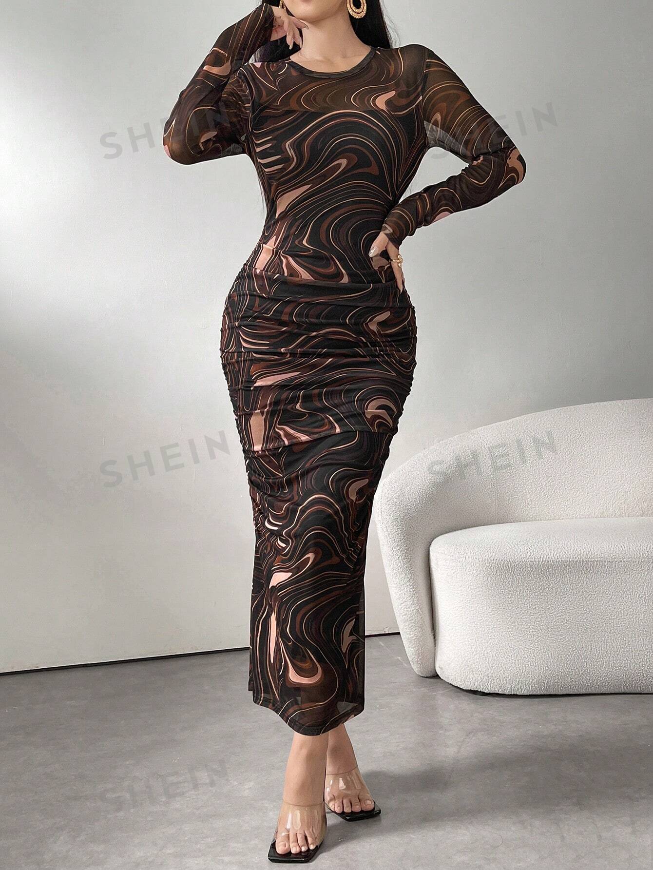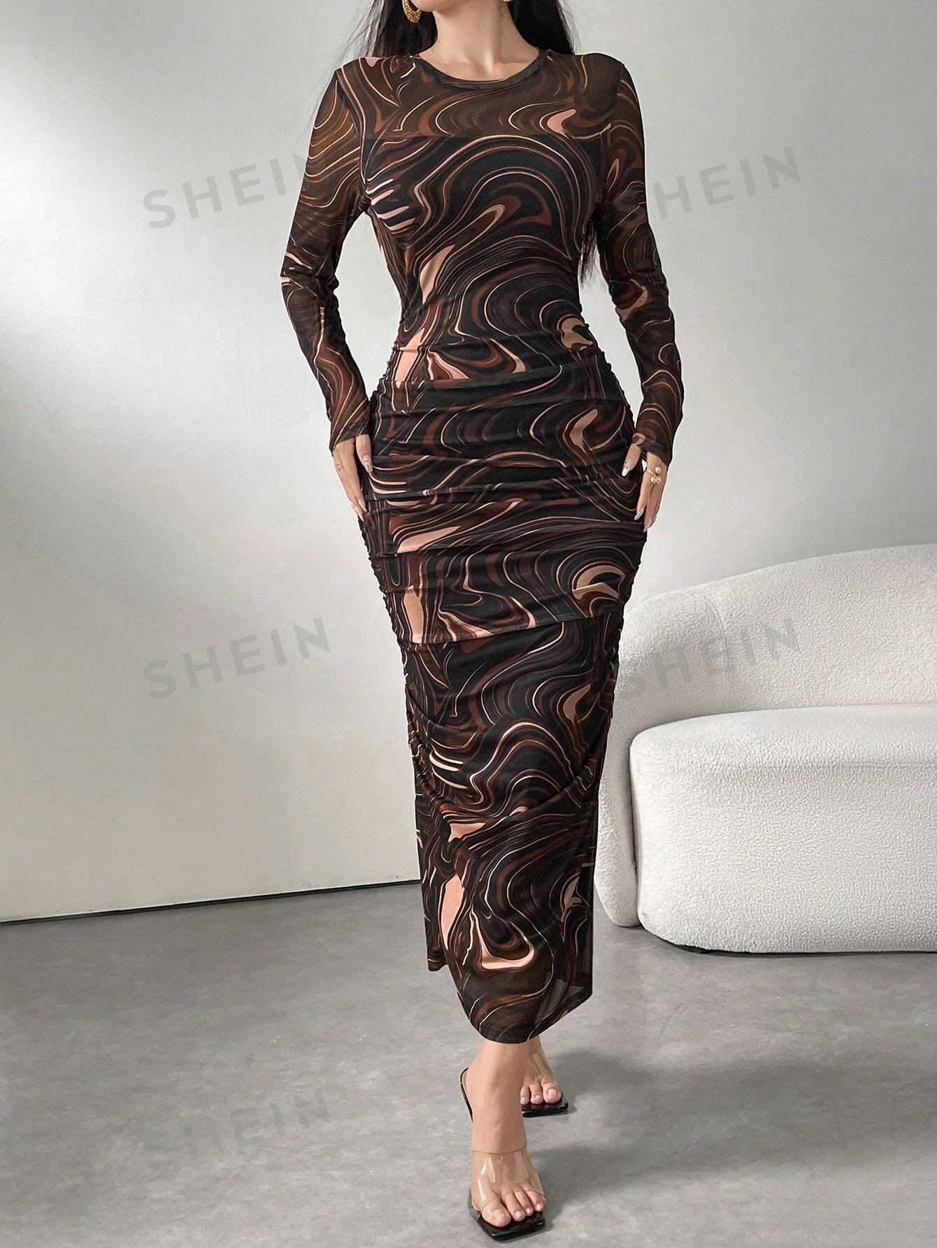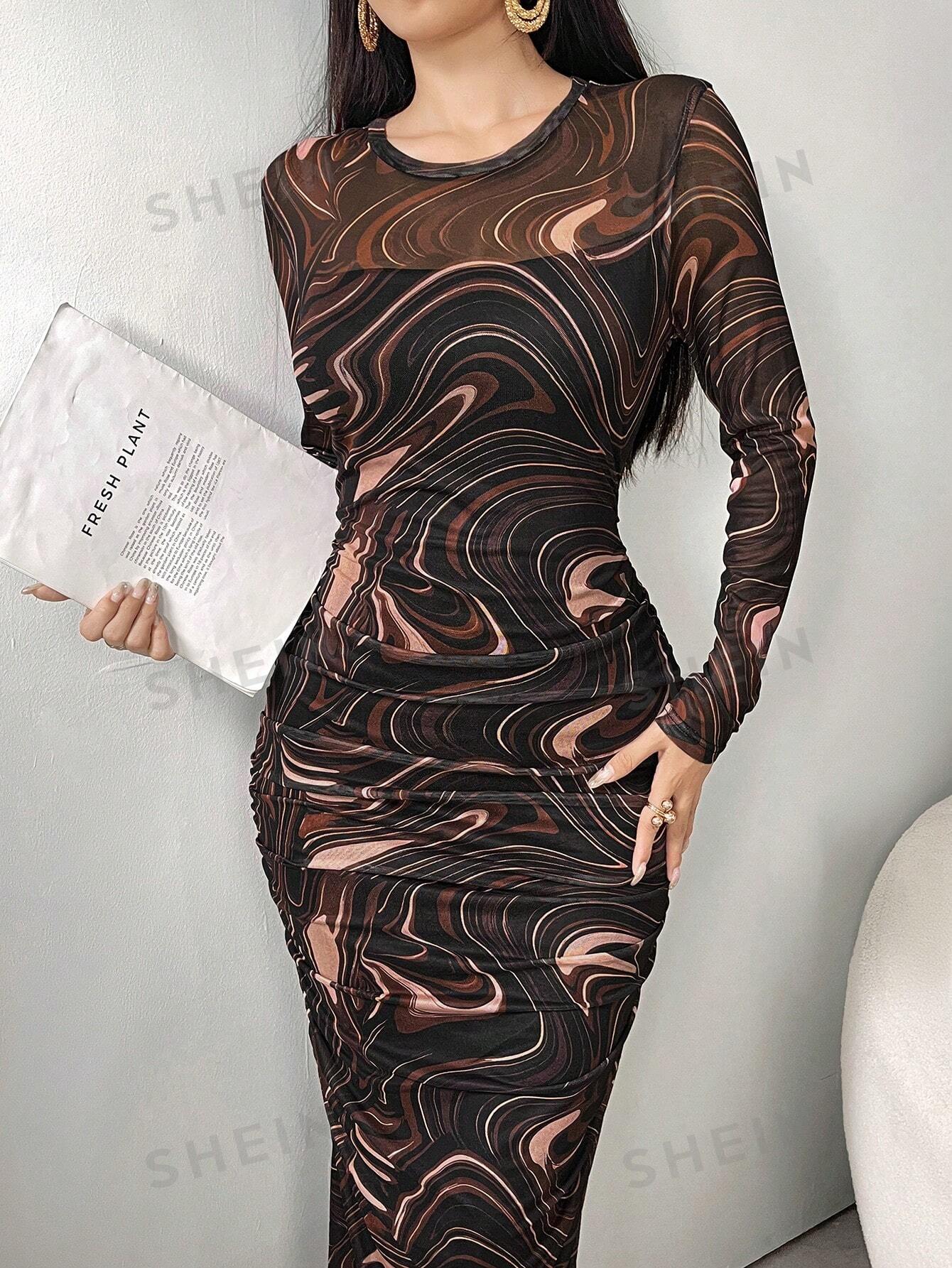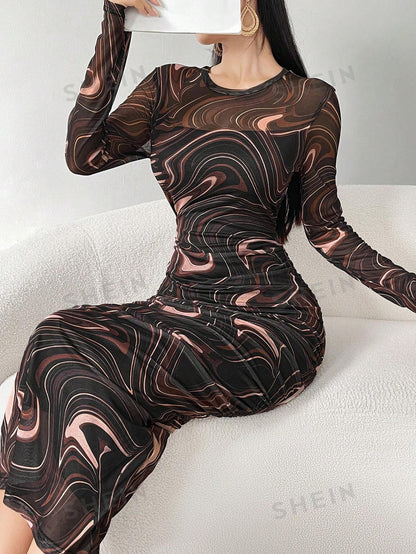 Modely Women Round Neck Long Sleeve Fitted Patterned Elegant Sheer Mesh Dress
