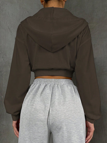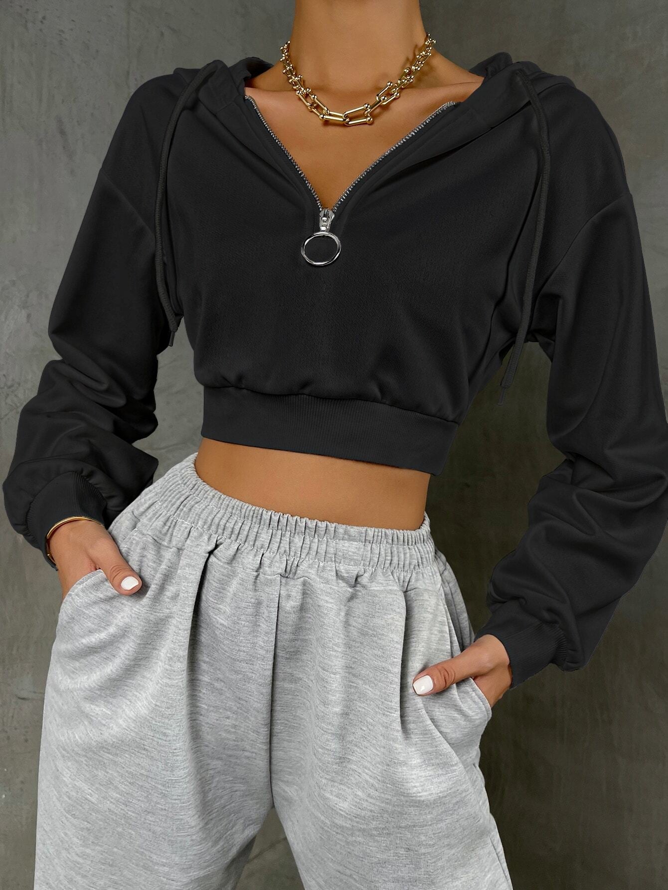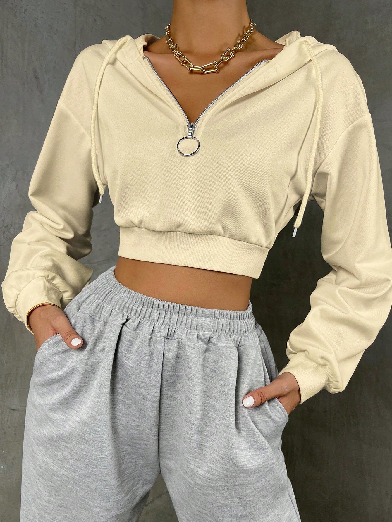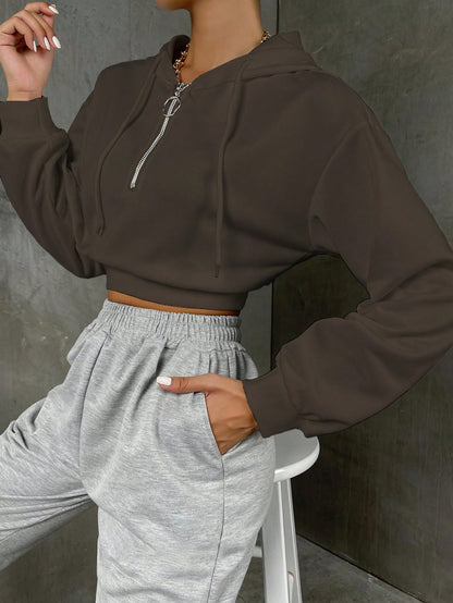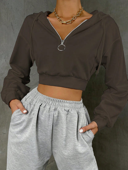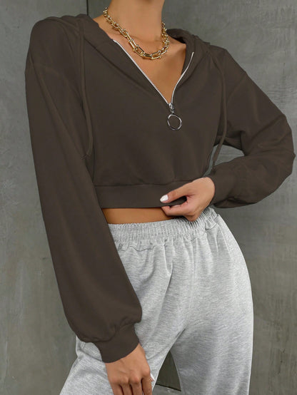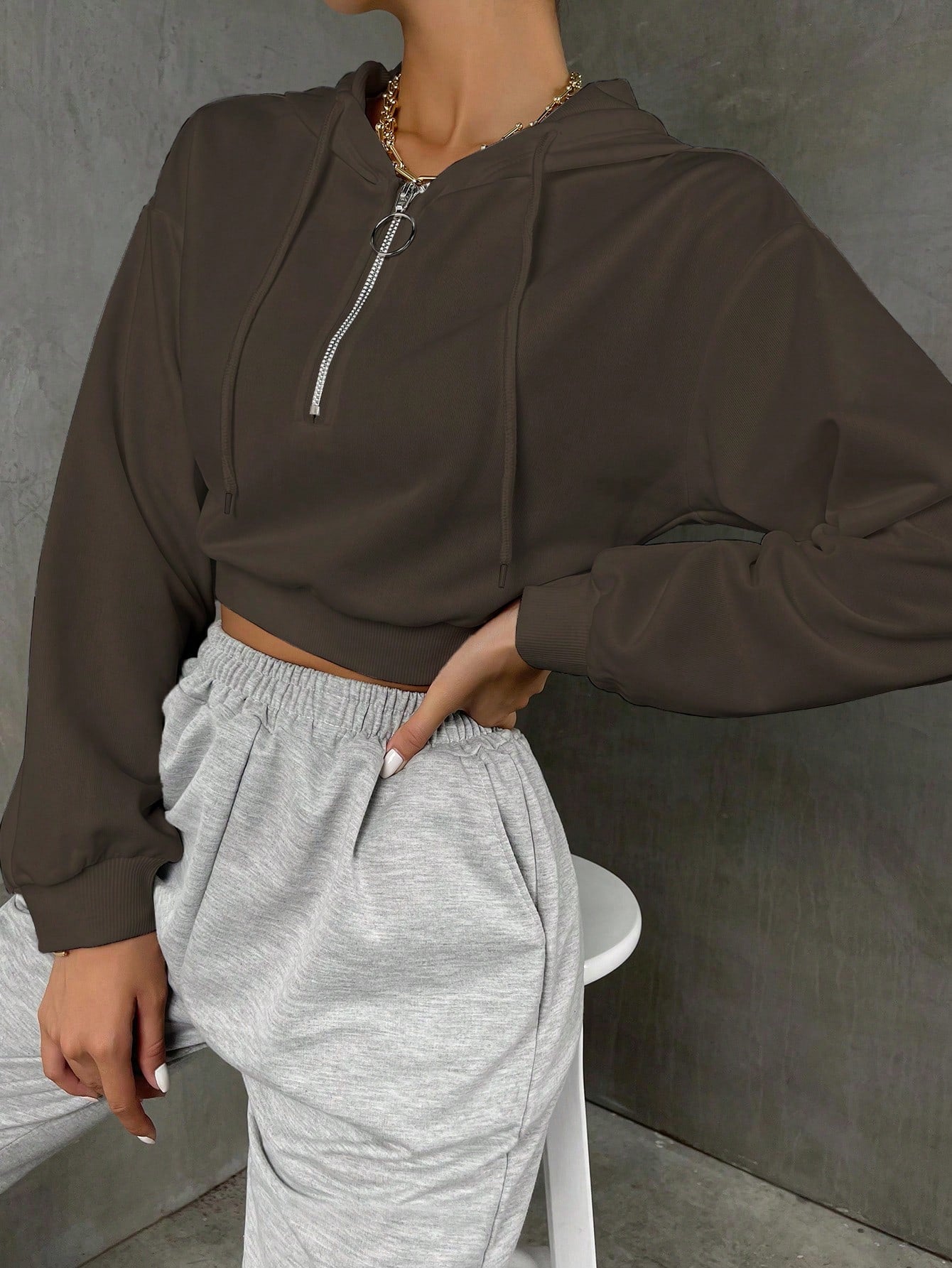 MOOSTA Women's Zip Half Placket Drop Shoulder Long Sleeve Hooded Cropped Sweatshirt, Autumn/Winter