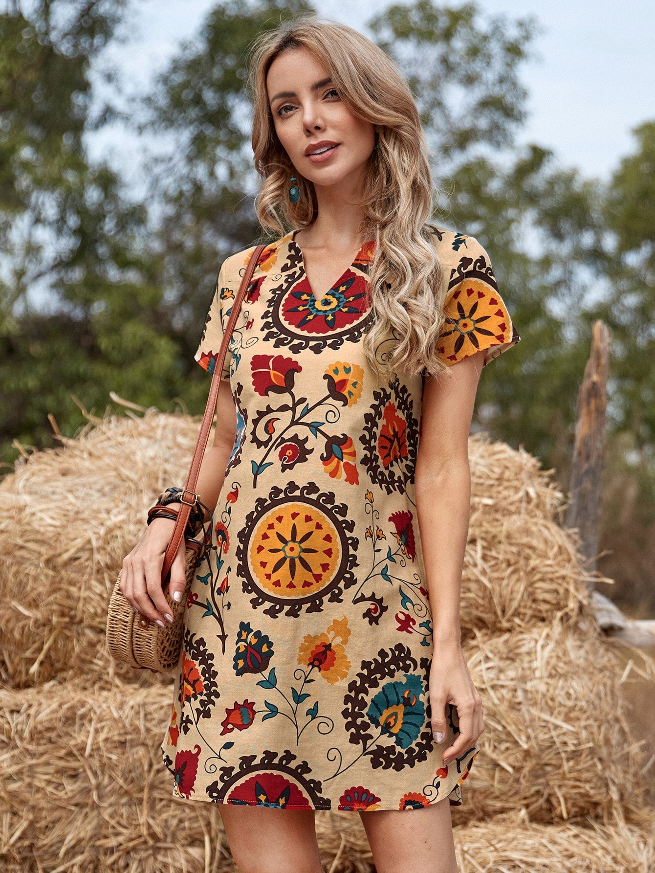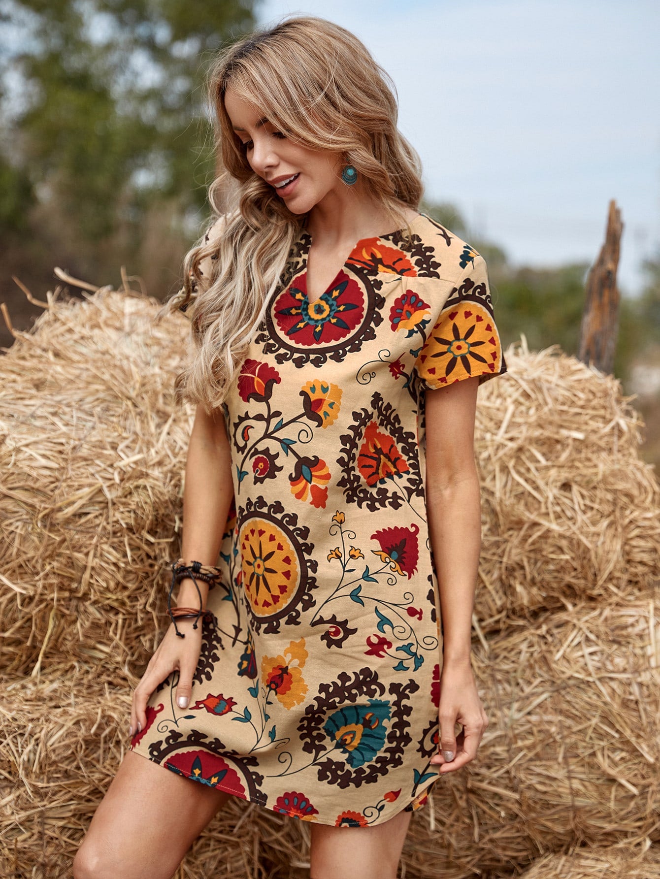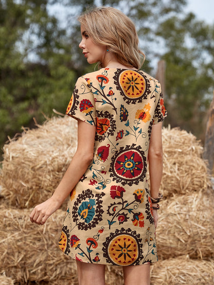 Notched Neck Floral Print Tunic Dress