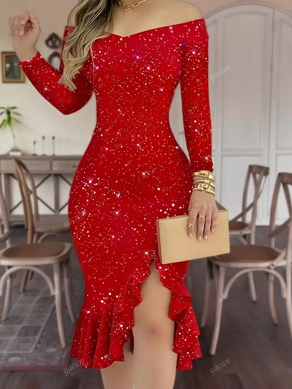 Off Shoulder Long Sleeve Solid Color Sexy High Slit Elegant Ruffle Hem Glitter Party Dress