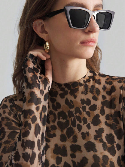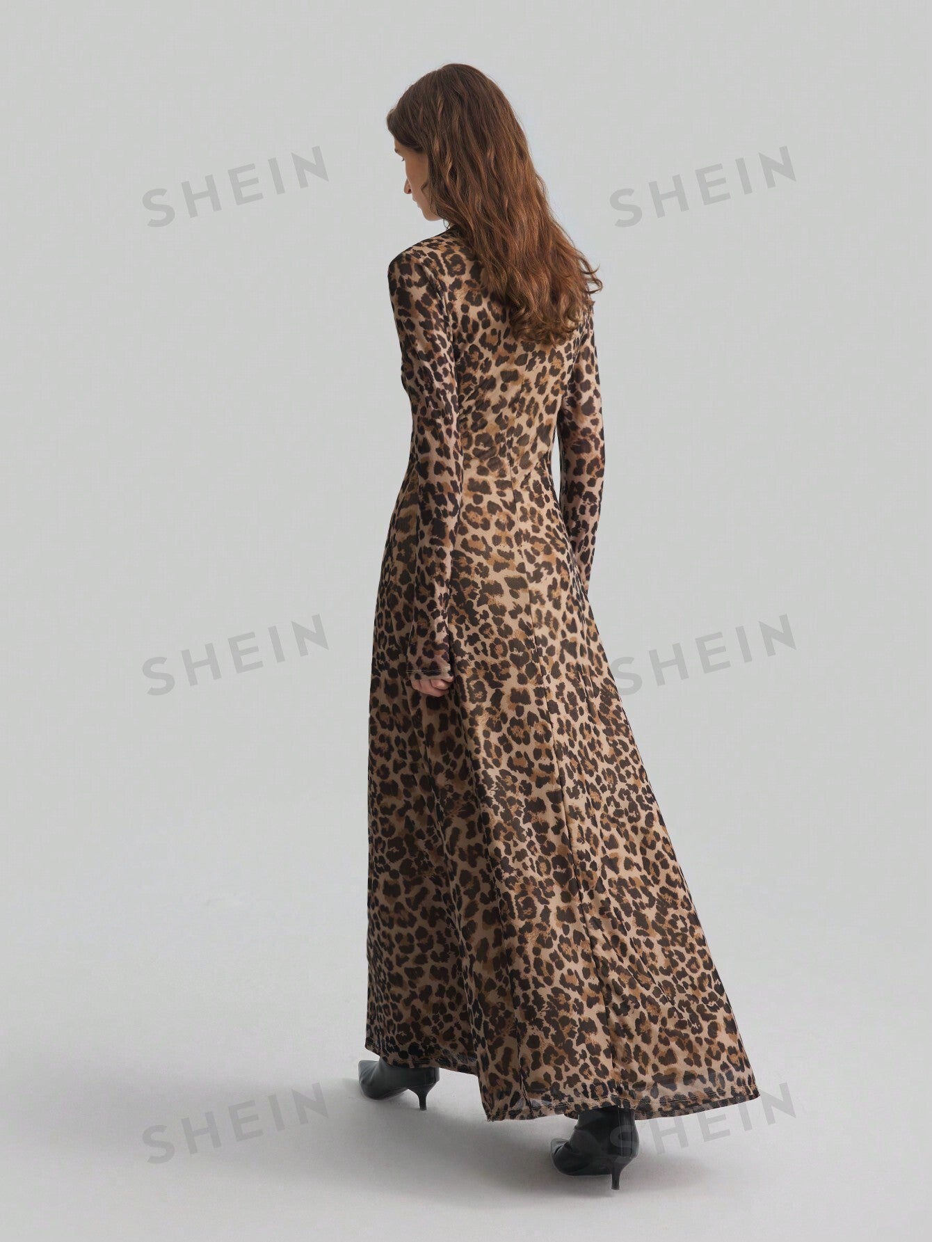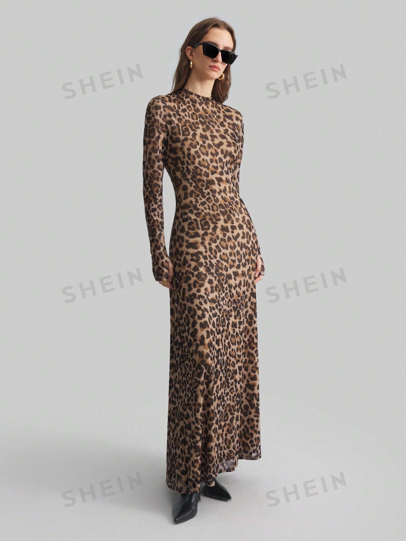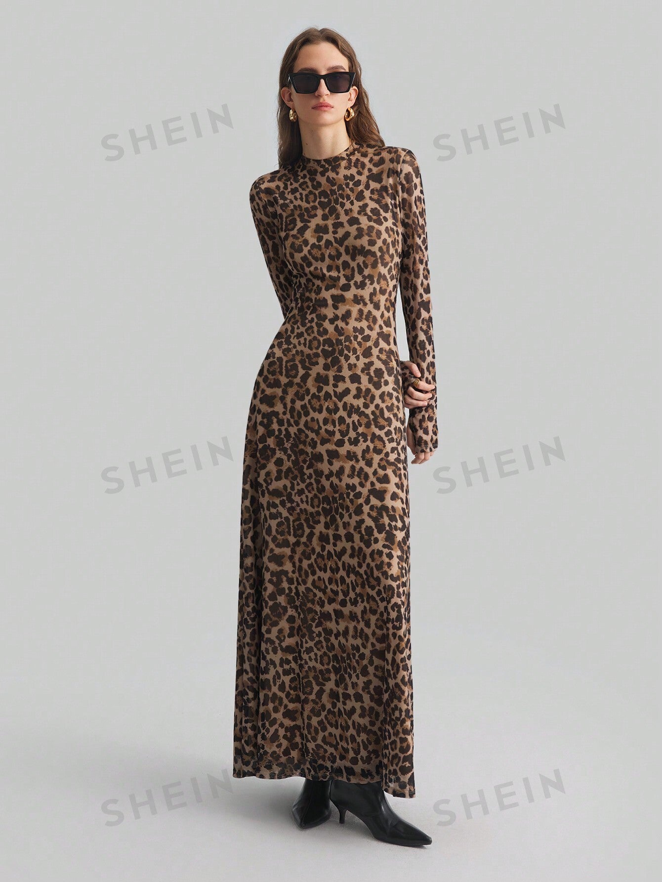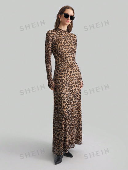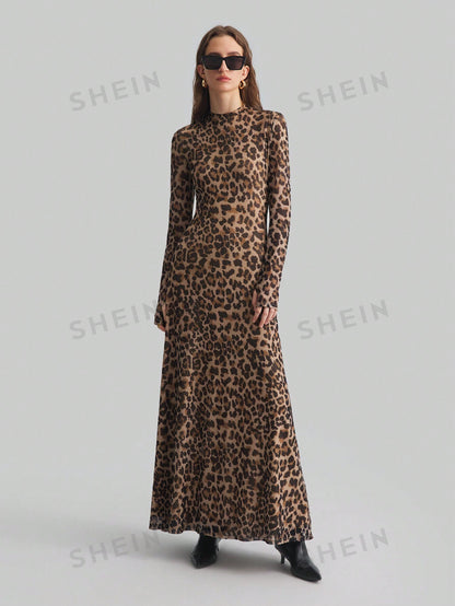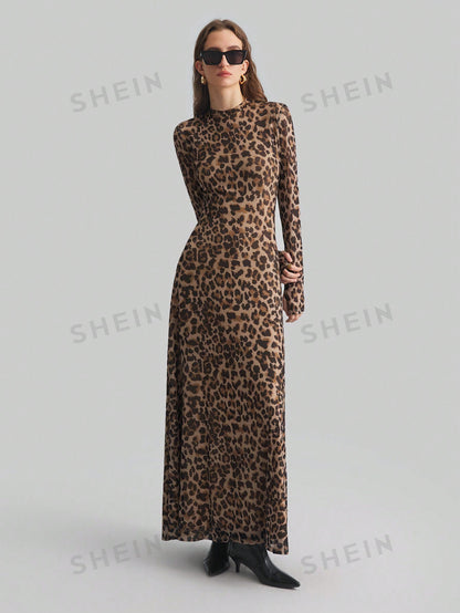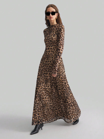 Ontre Leopard Print Round Neck Slim Sexy, Autumn And Winter Long Dress Party Women's Clothing