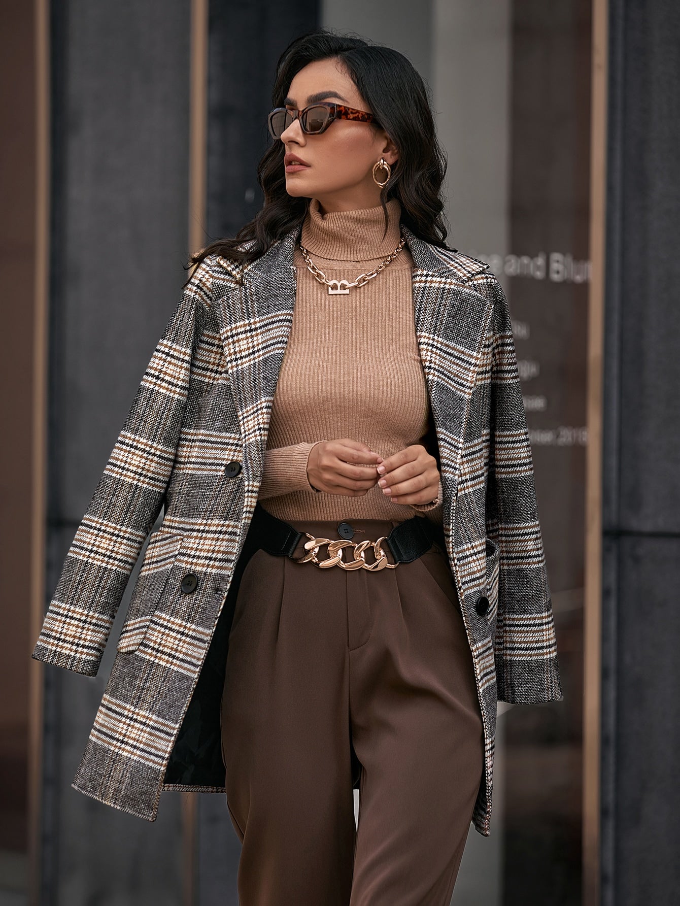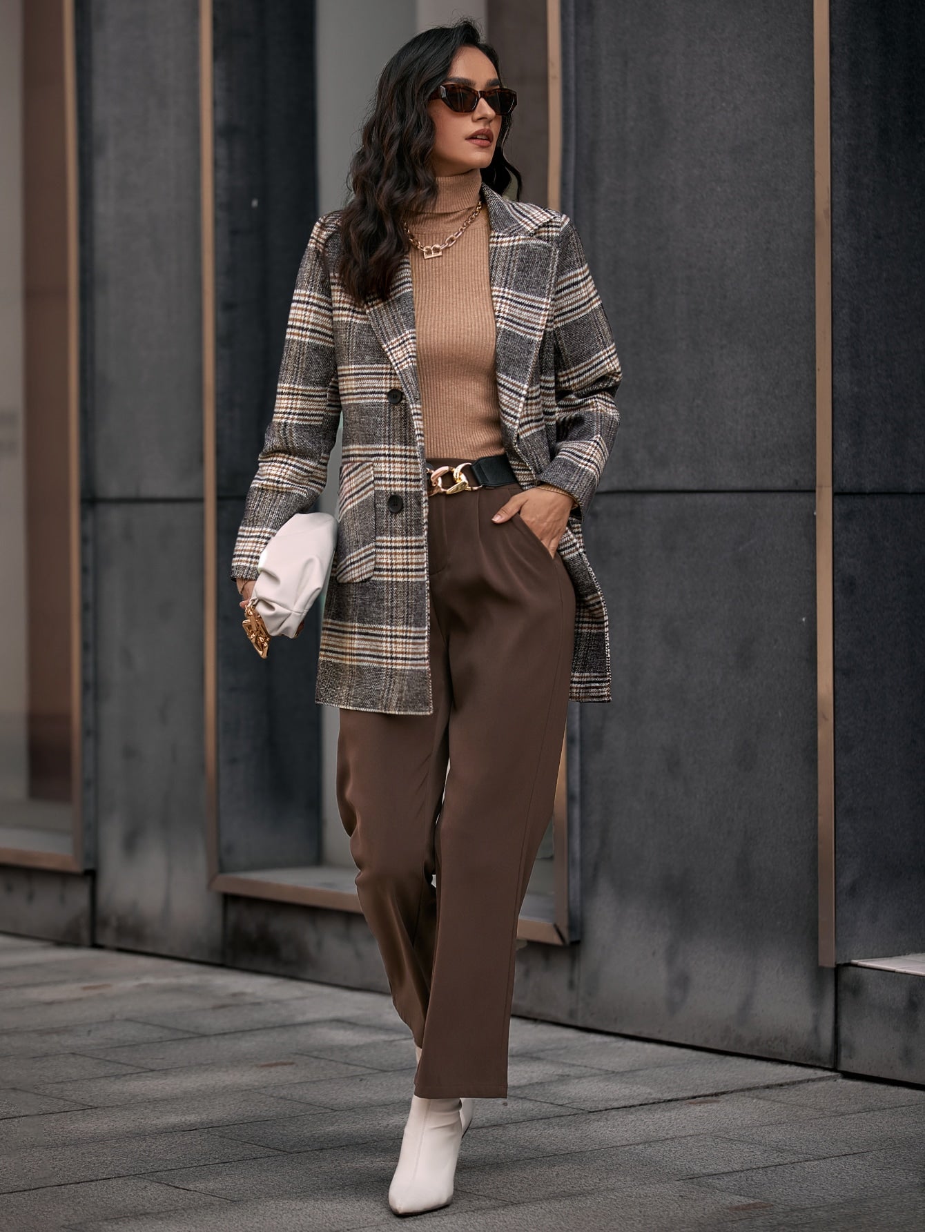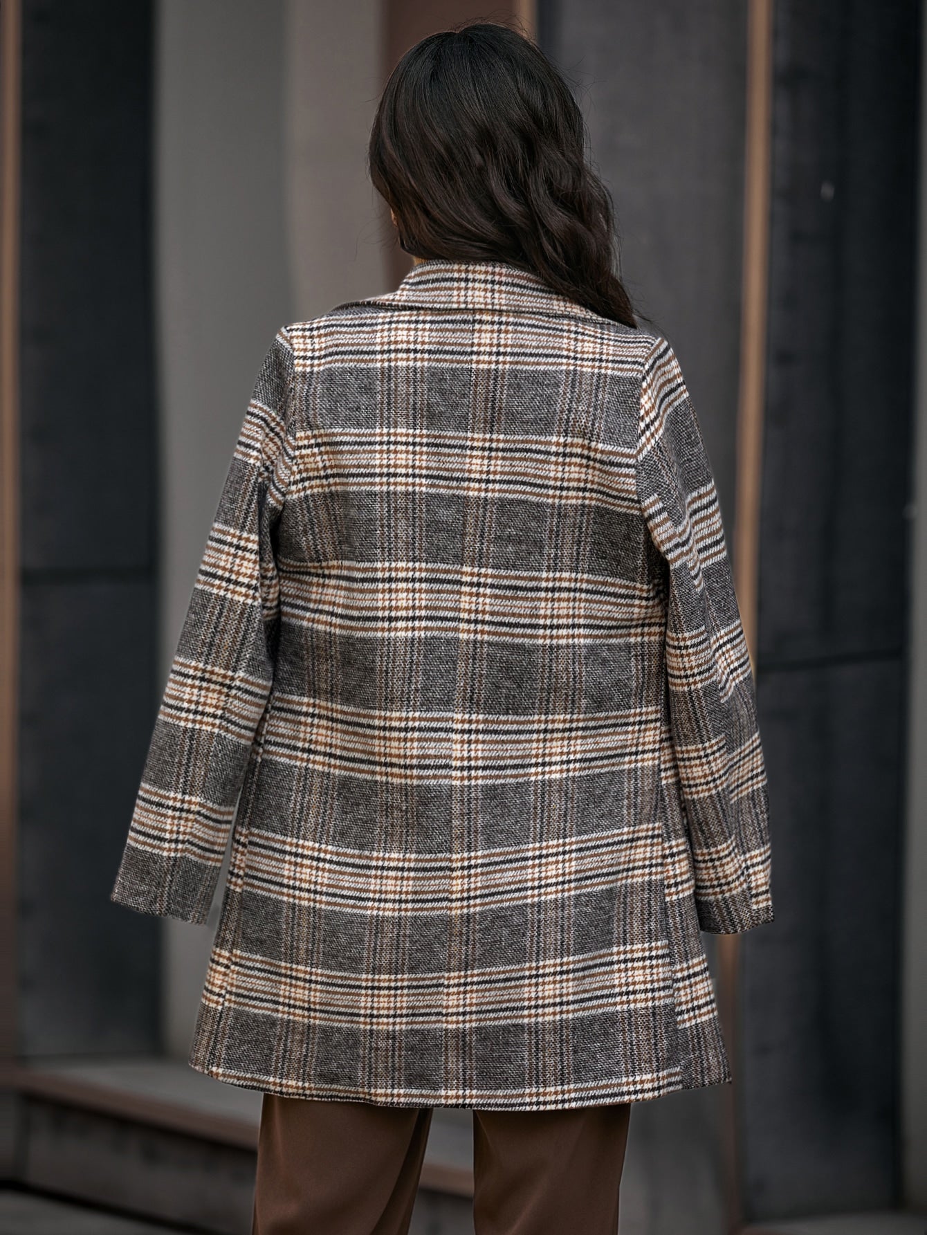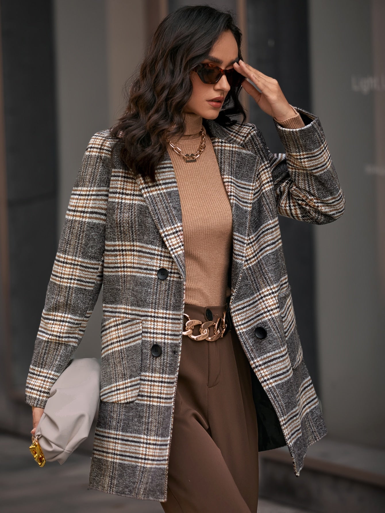 Plaid Pattern Lapel Neck Double Breasted Patched Pocket Overcoat