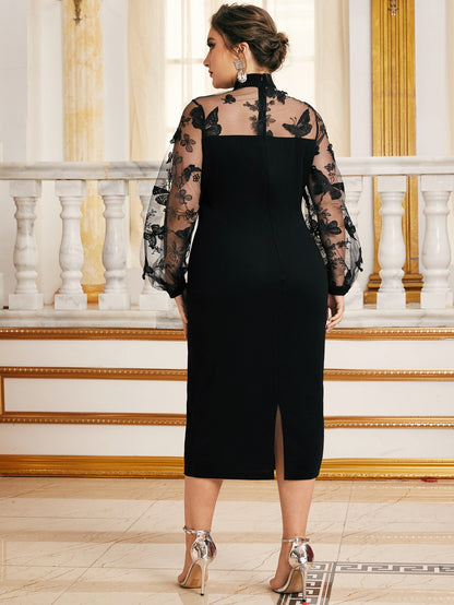 Plus Butterfly Appliques Mesh Tie Neck Split Hem Dress