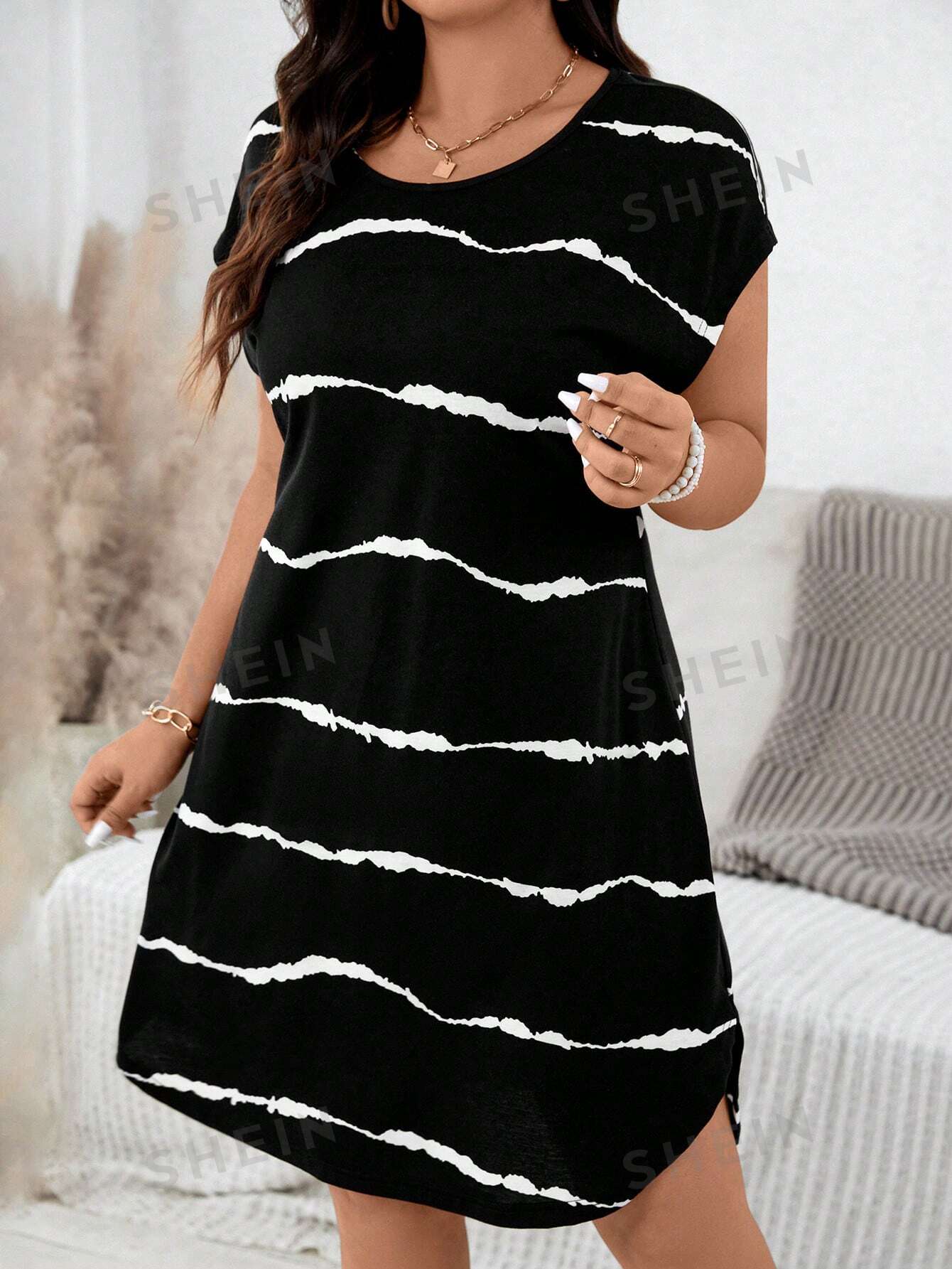 Plus Size Women's Summer Casual Dress Black Color Block Striped T Shirt Dress