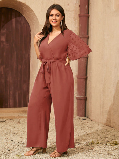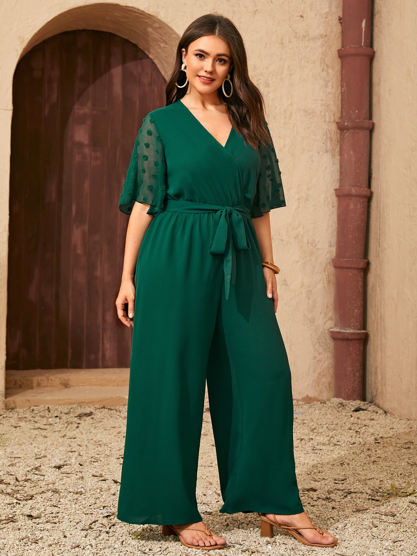 Plus Swiss Dot Butterfly Sleeve Wide Leg Belted Jumpsuit