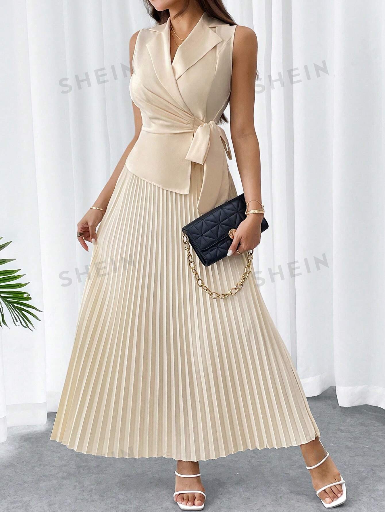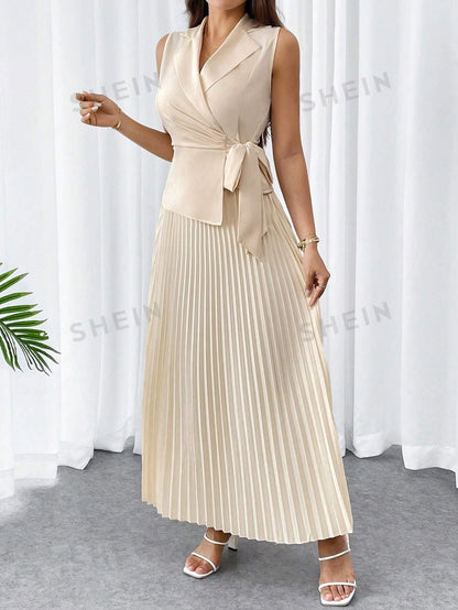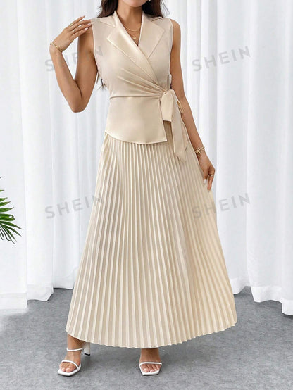 Privé Women's Summer Minimalist & Elegant Commuter Style Work/Business Khaki Wrap Belted Bow Suit Vest & Pleated Maxi Skirt
