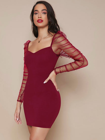Ruched Sheer Mesh Gigot Sleeve Bodycon Dress