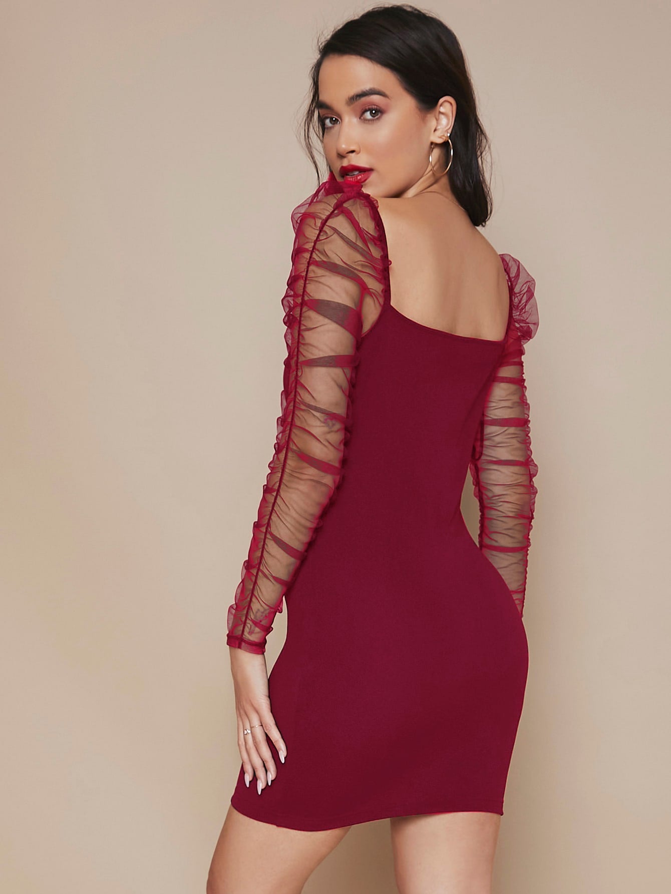 Ruched Sheer Mesh Gigot Sleeve Bodycon Dress