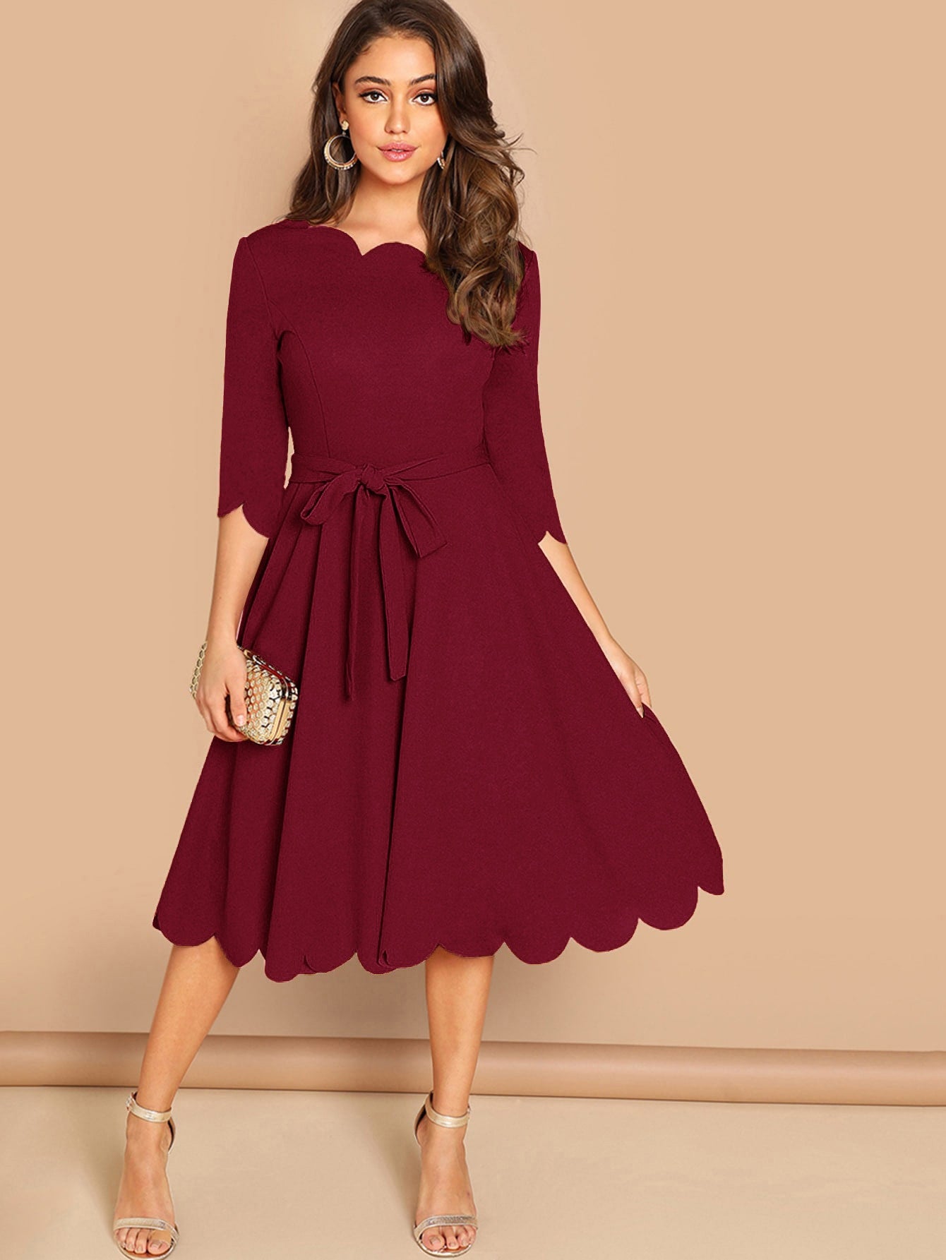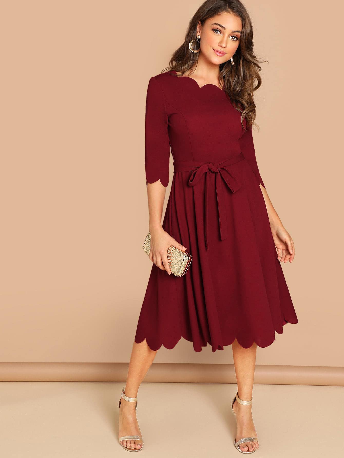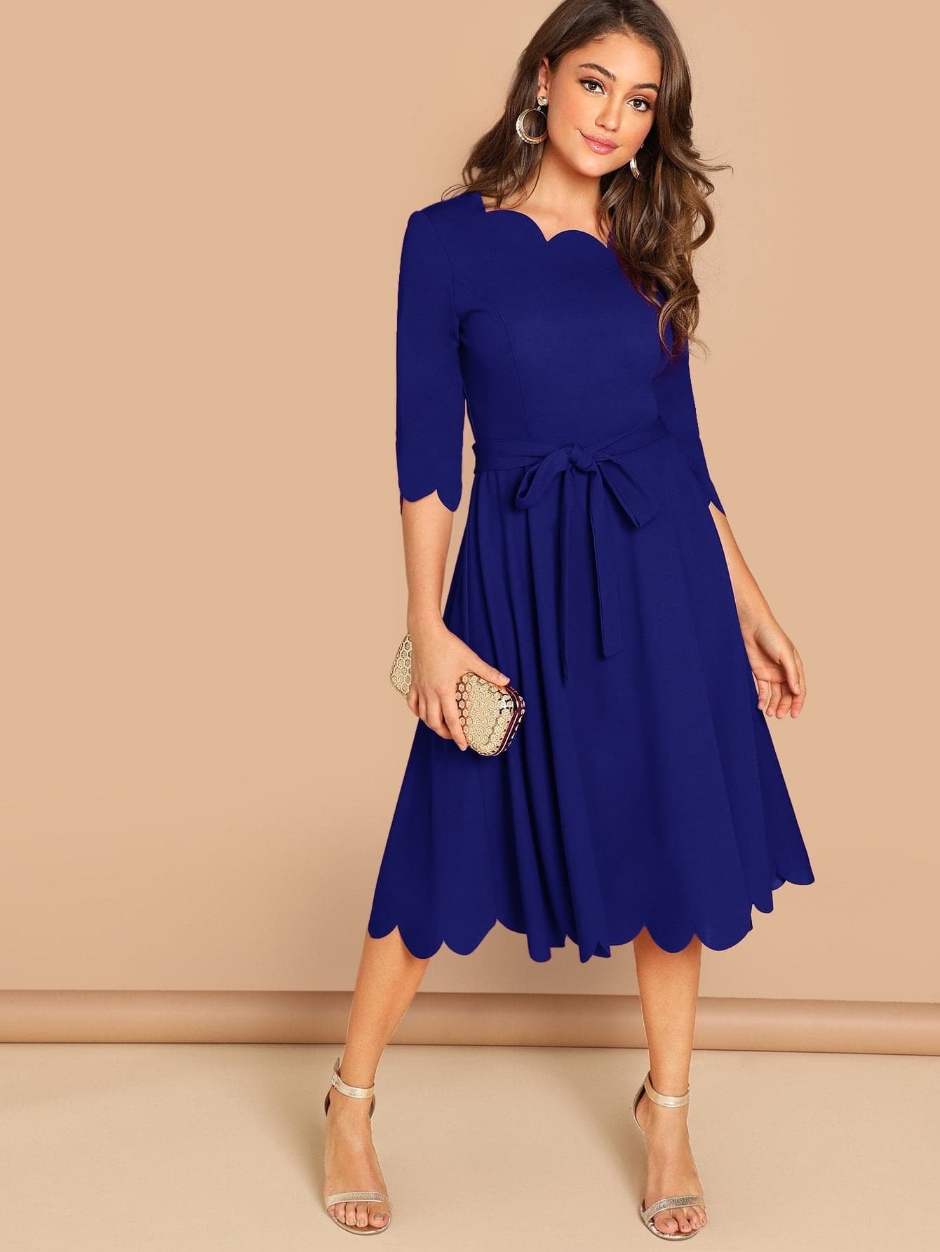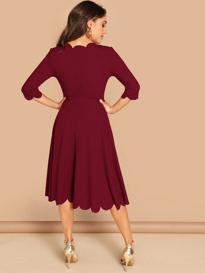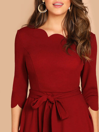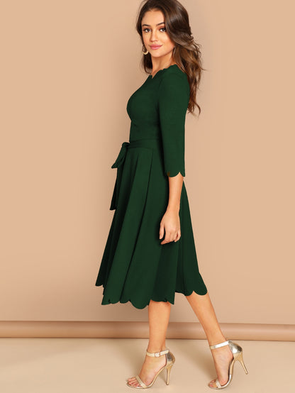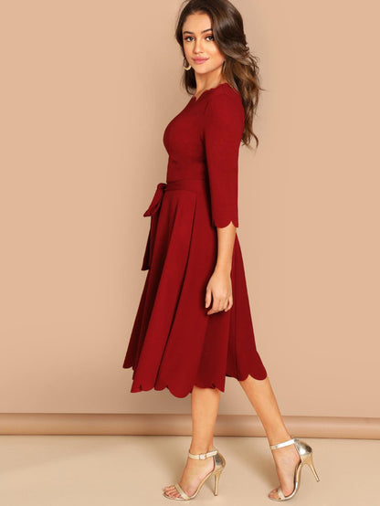 Scallop Trim Fit & Flare Dress With Belt
