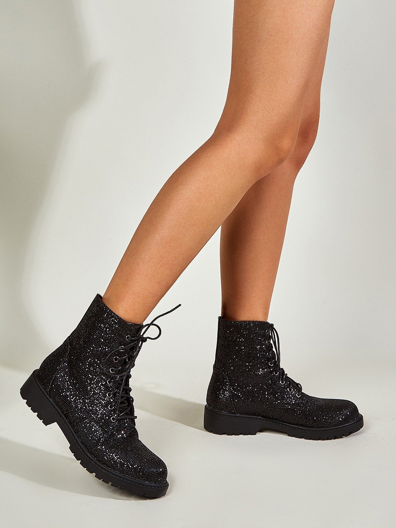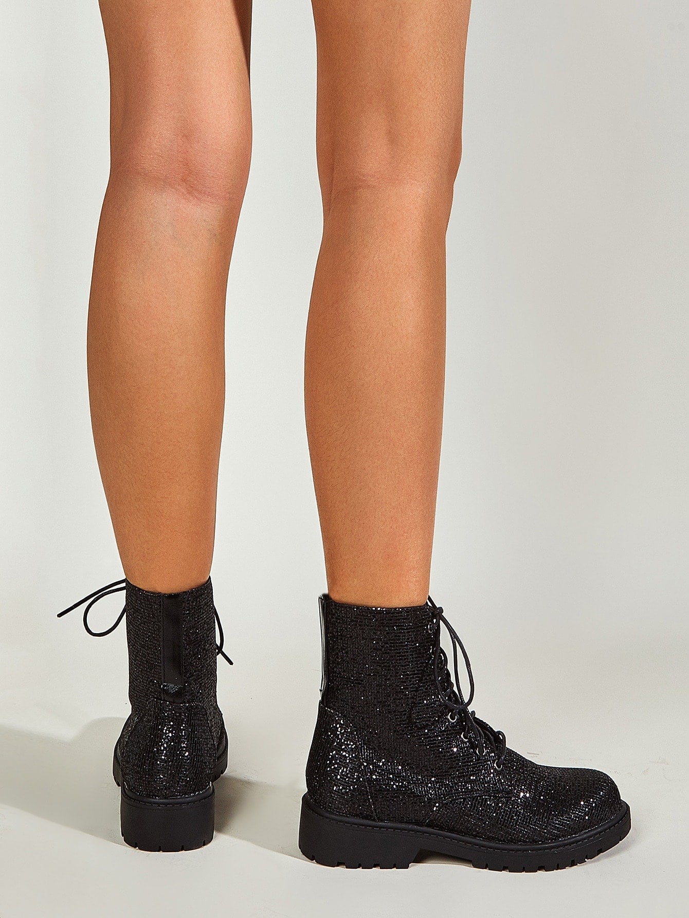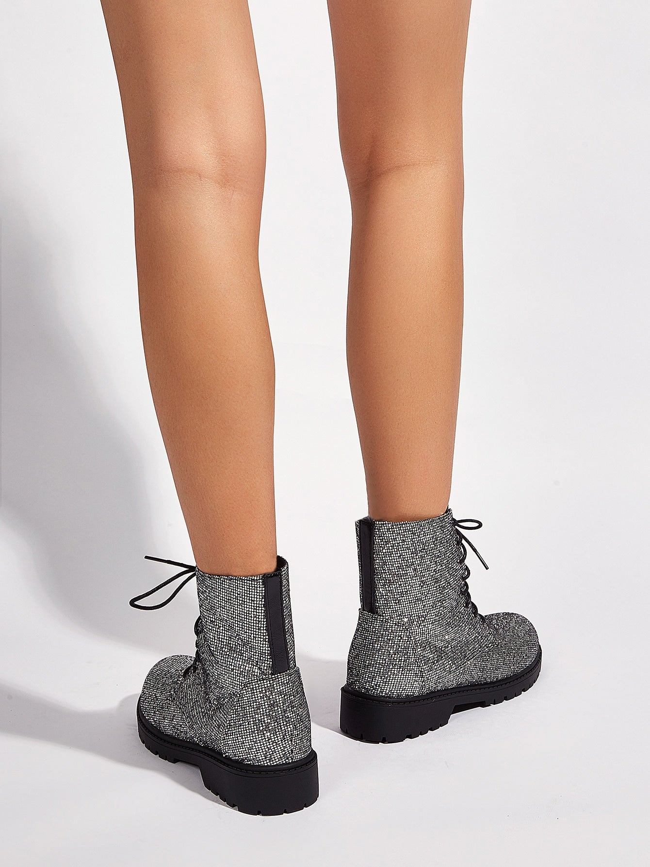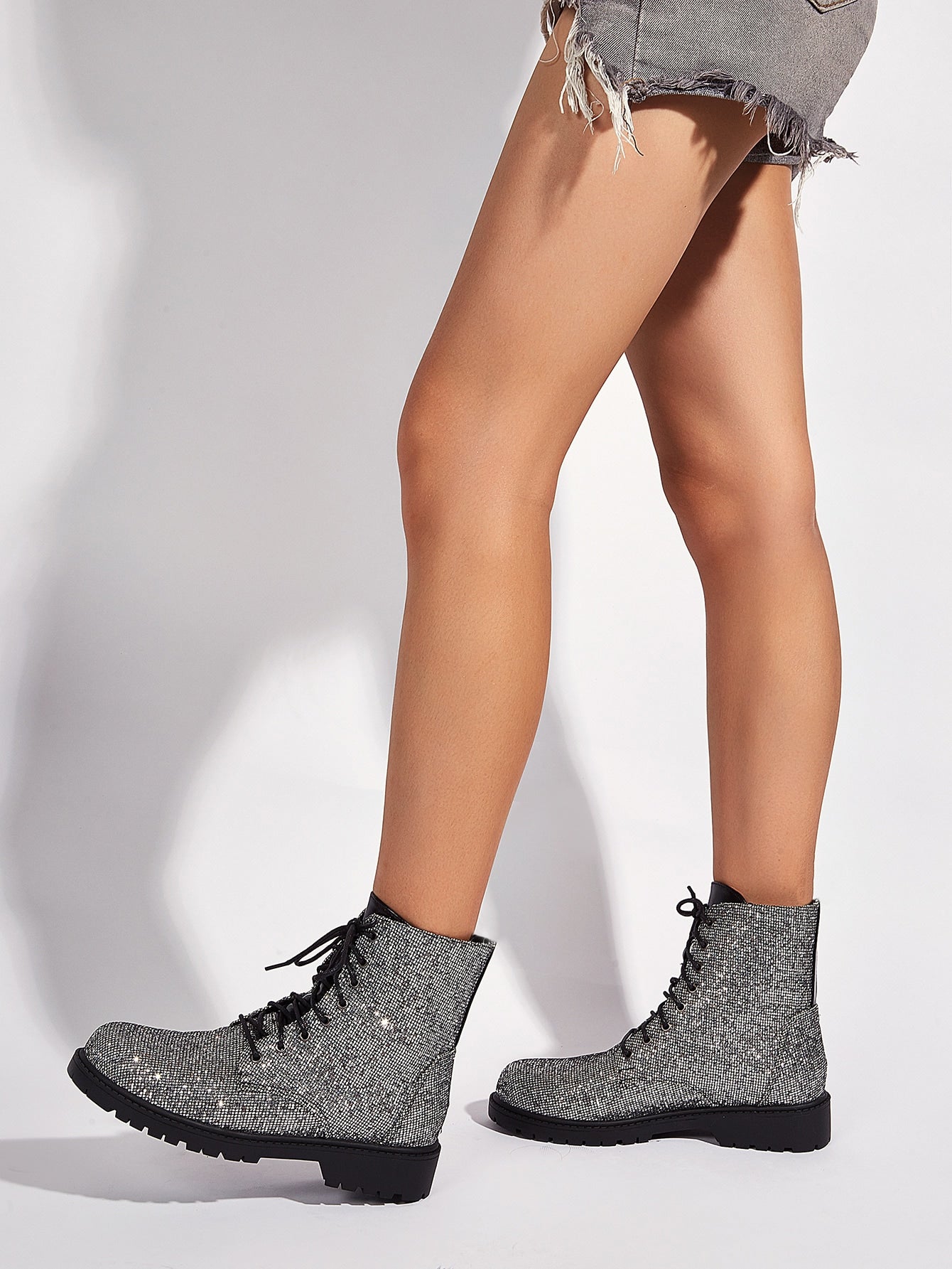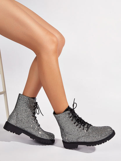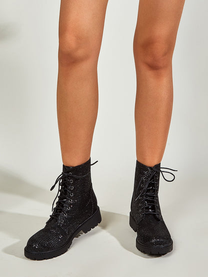 Sequins Decor Lace-up Front Side Zipper Combat Boots