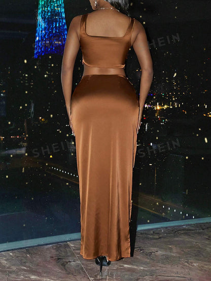 Slayr 1 Set Women's Shiny Ribbed Scoop Neck Tank Top And High Slit Ruched Mini Skirt Outfit