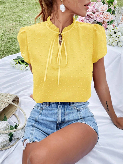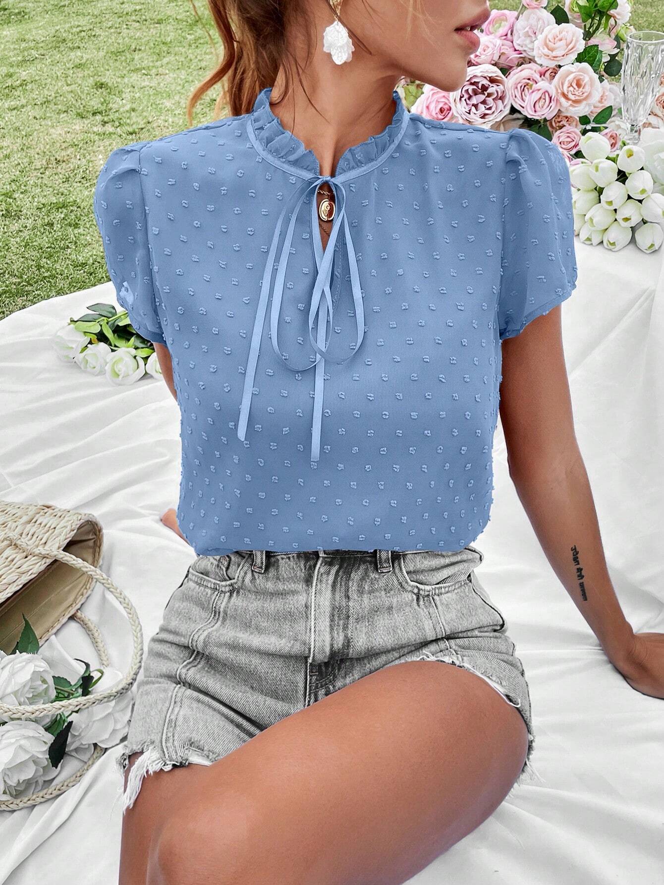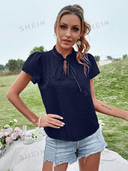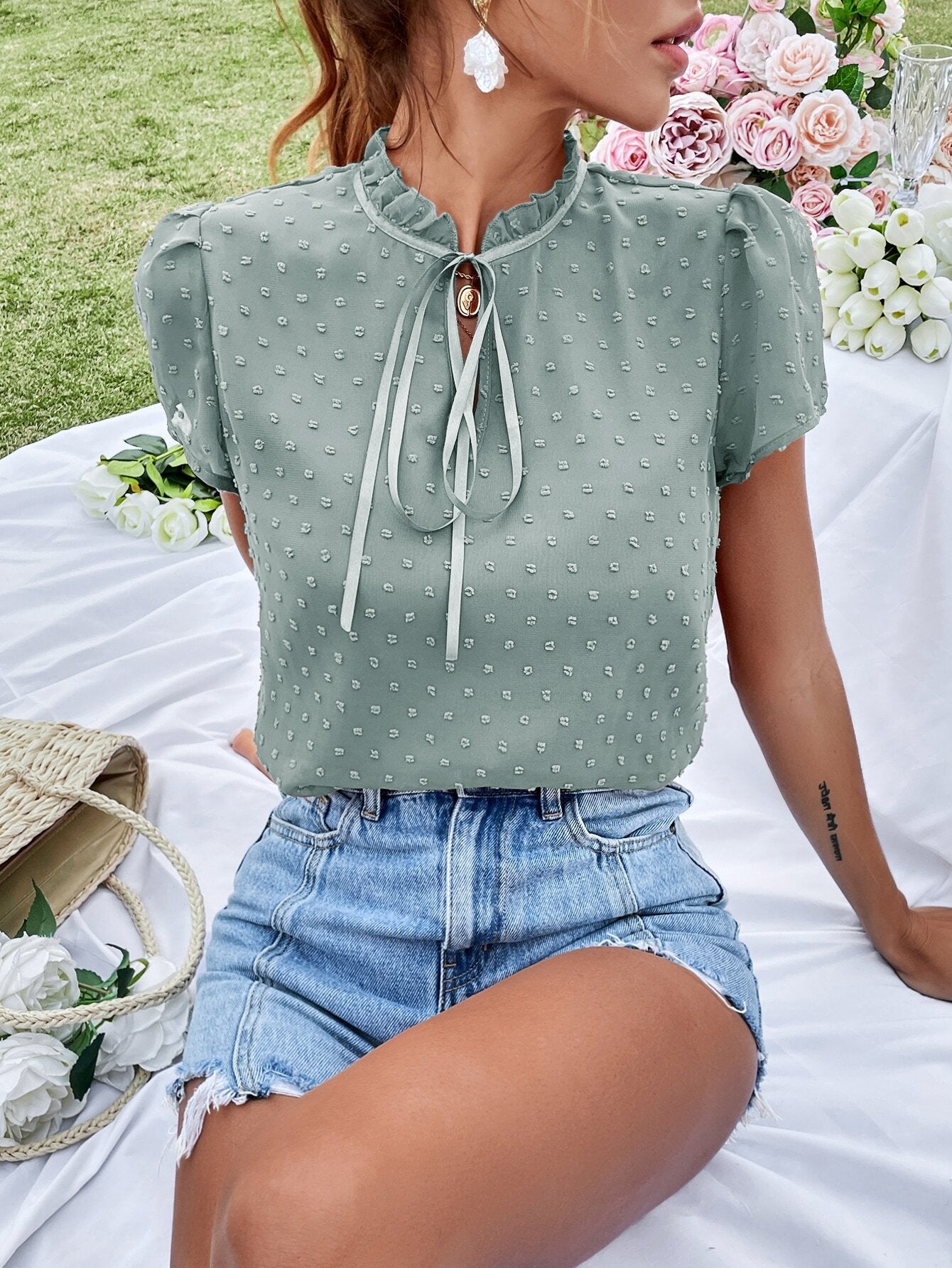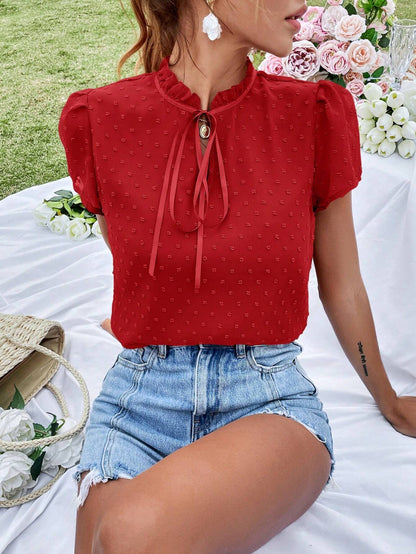 Swiss Dot Tie Neck Puff Sleeve Frill Trim Blouse