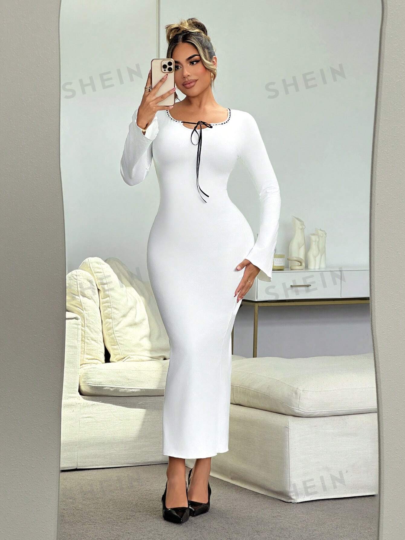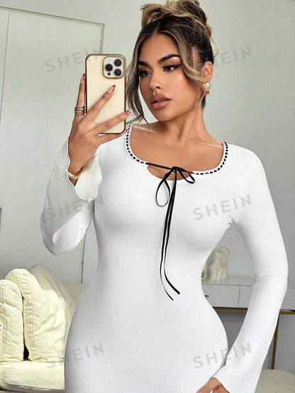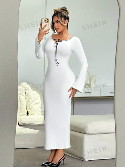 SXY Women's Contrast Color Panel Front Tie Long Sleeve Fitted Midi Dress