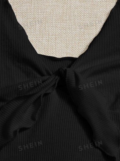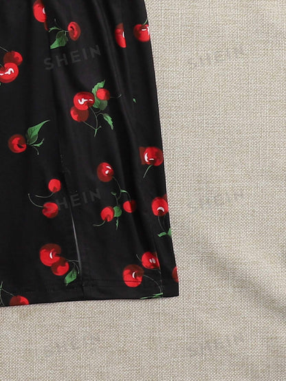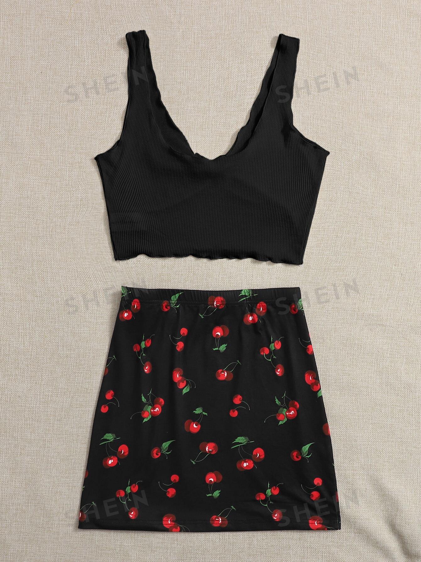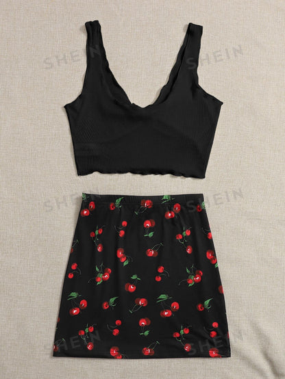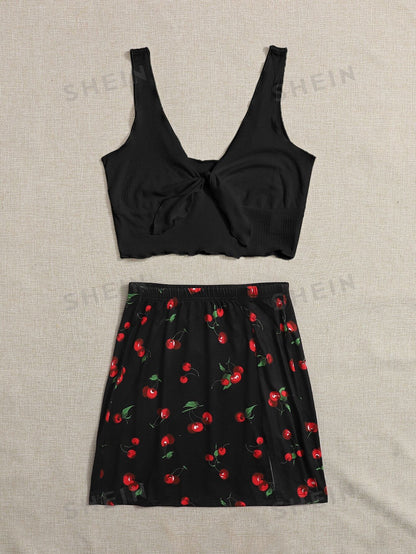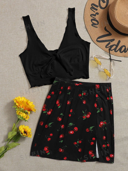 Tie Front Rib-knit Tank Top & Split Hem Cherry Print Skirt Set