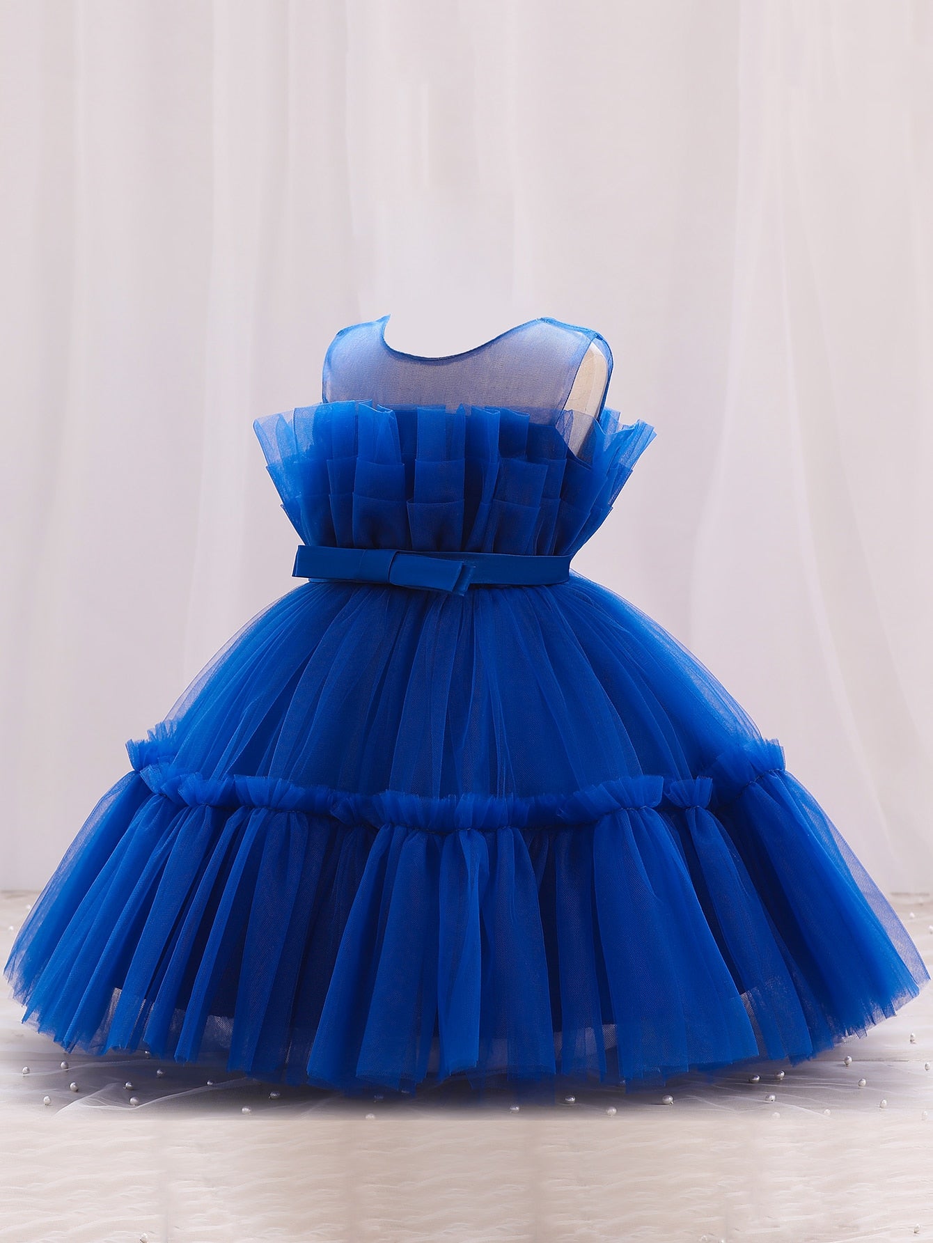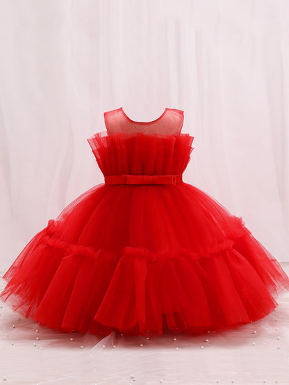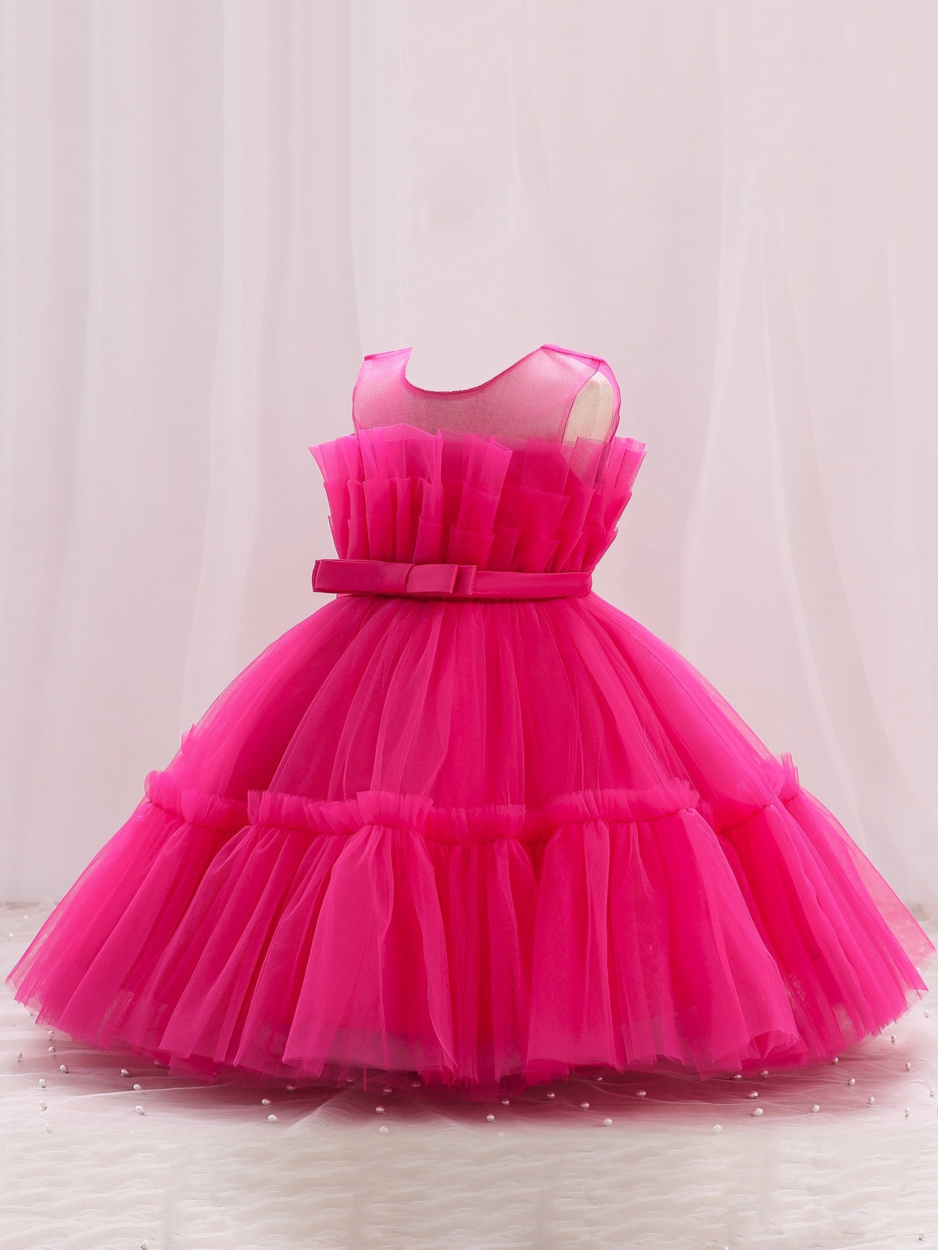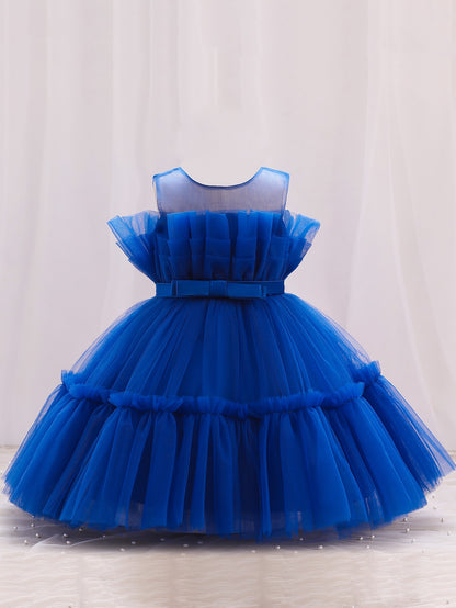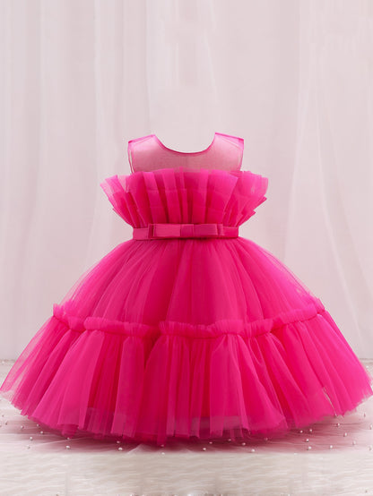 Toddler Girls Bow Front Ruffle Hem Mesh Gown Dress