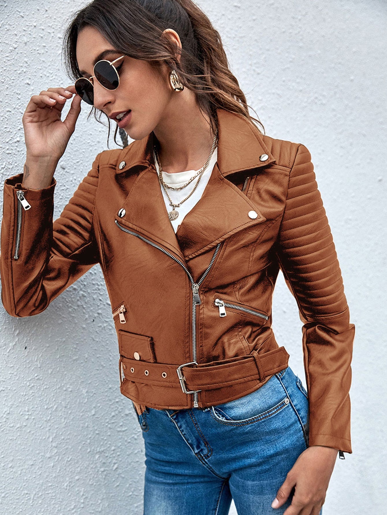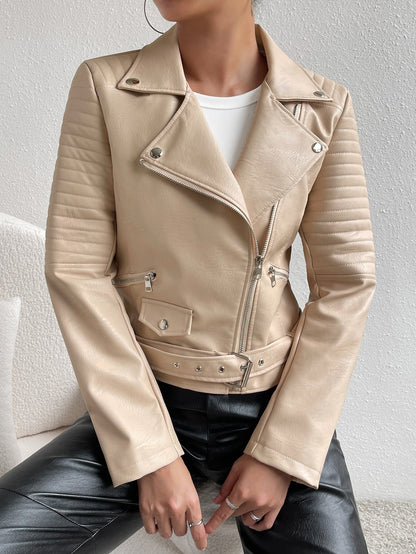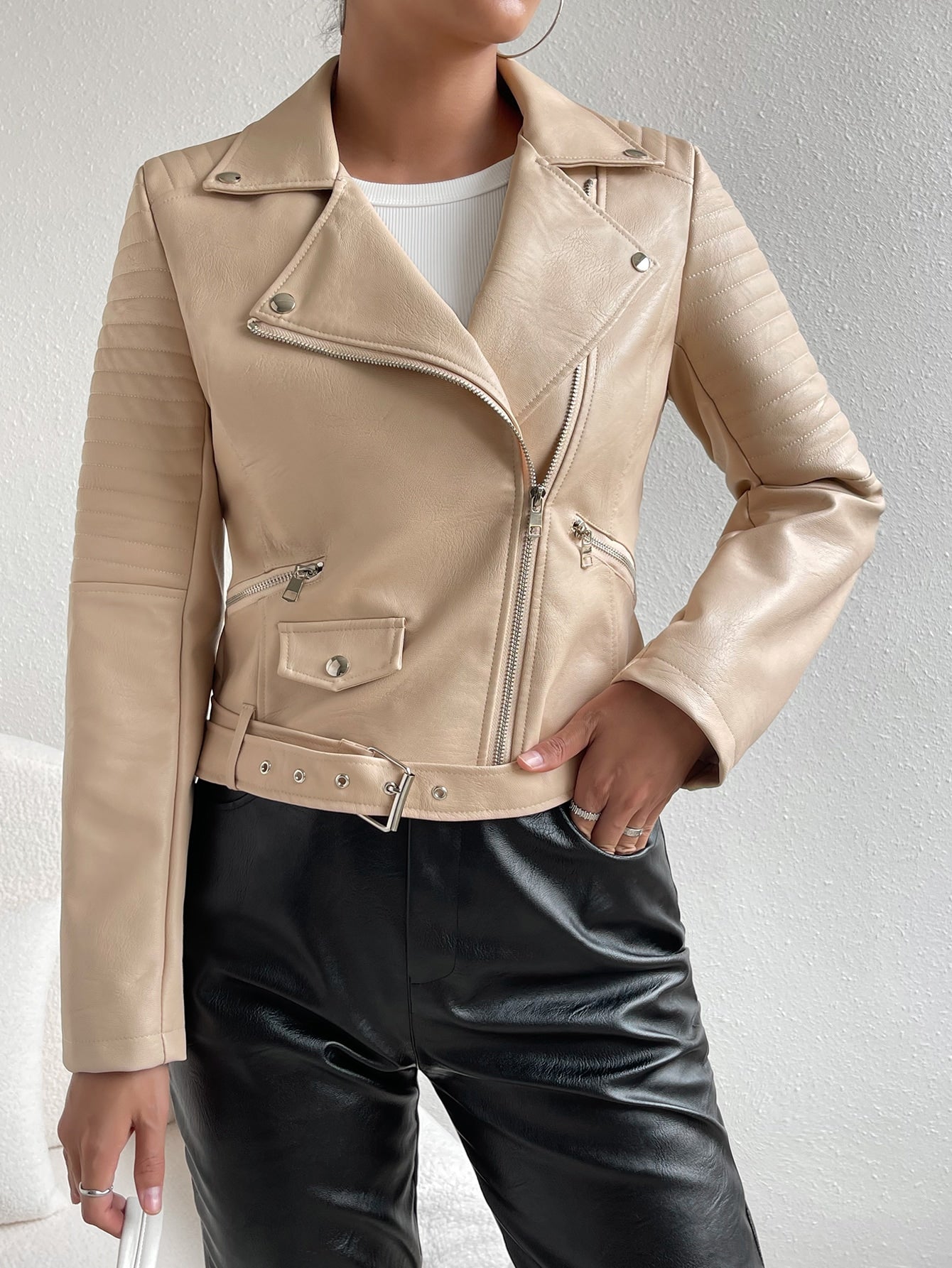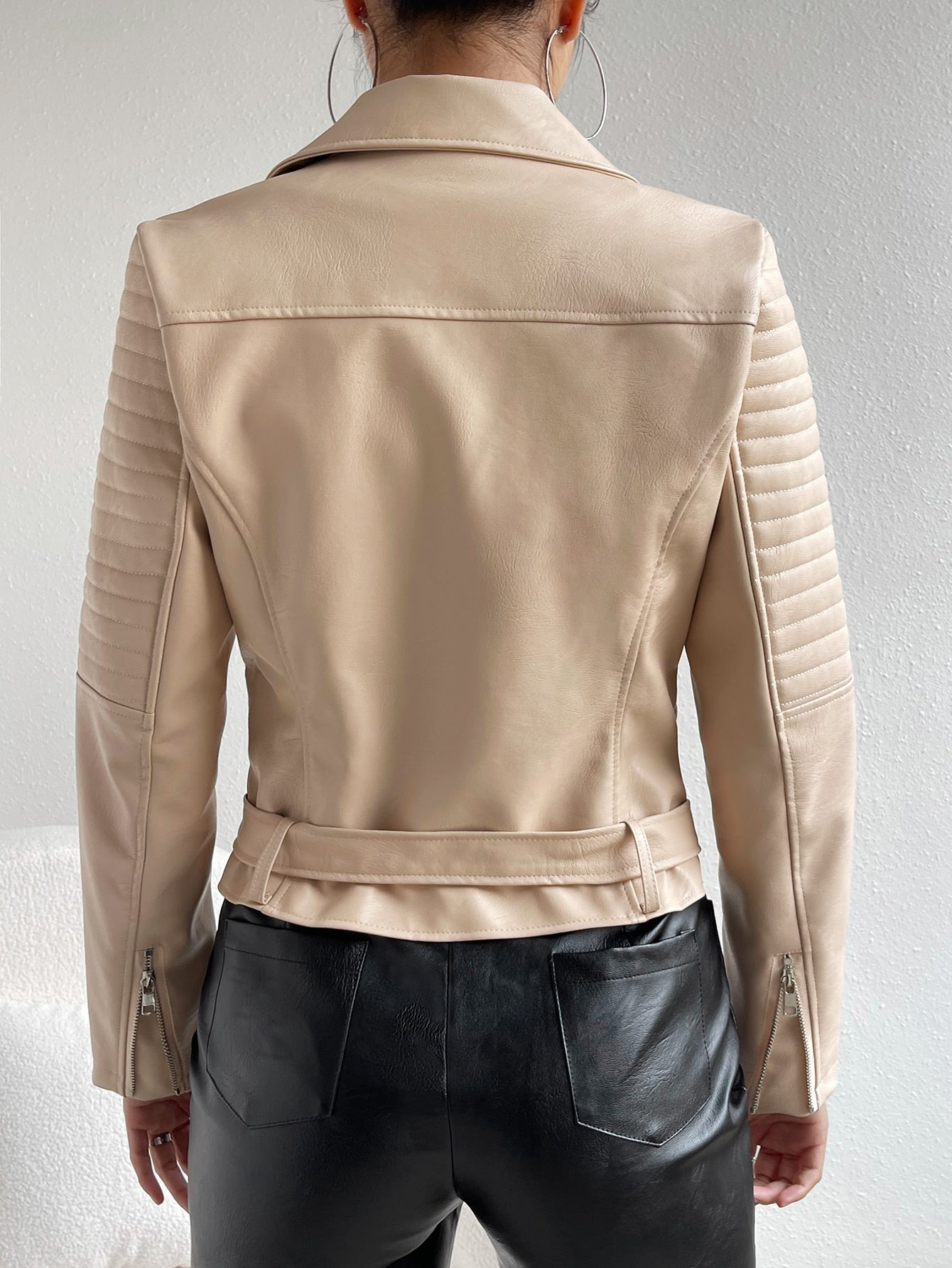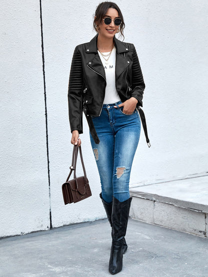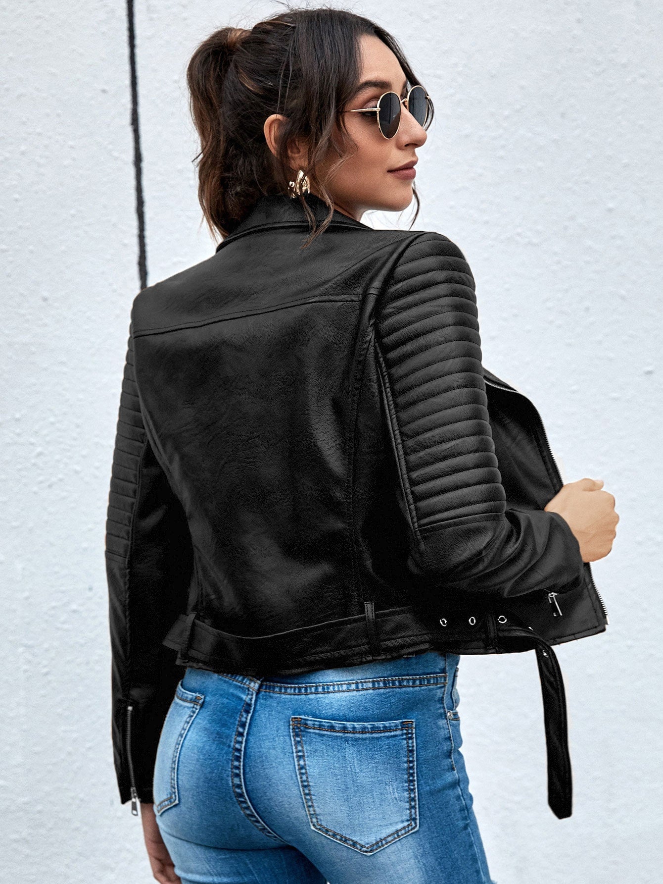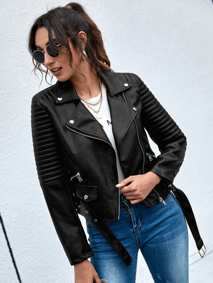 Unity Lapel Collar Belted Zip Up PU Biker Jacket