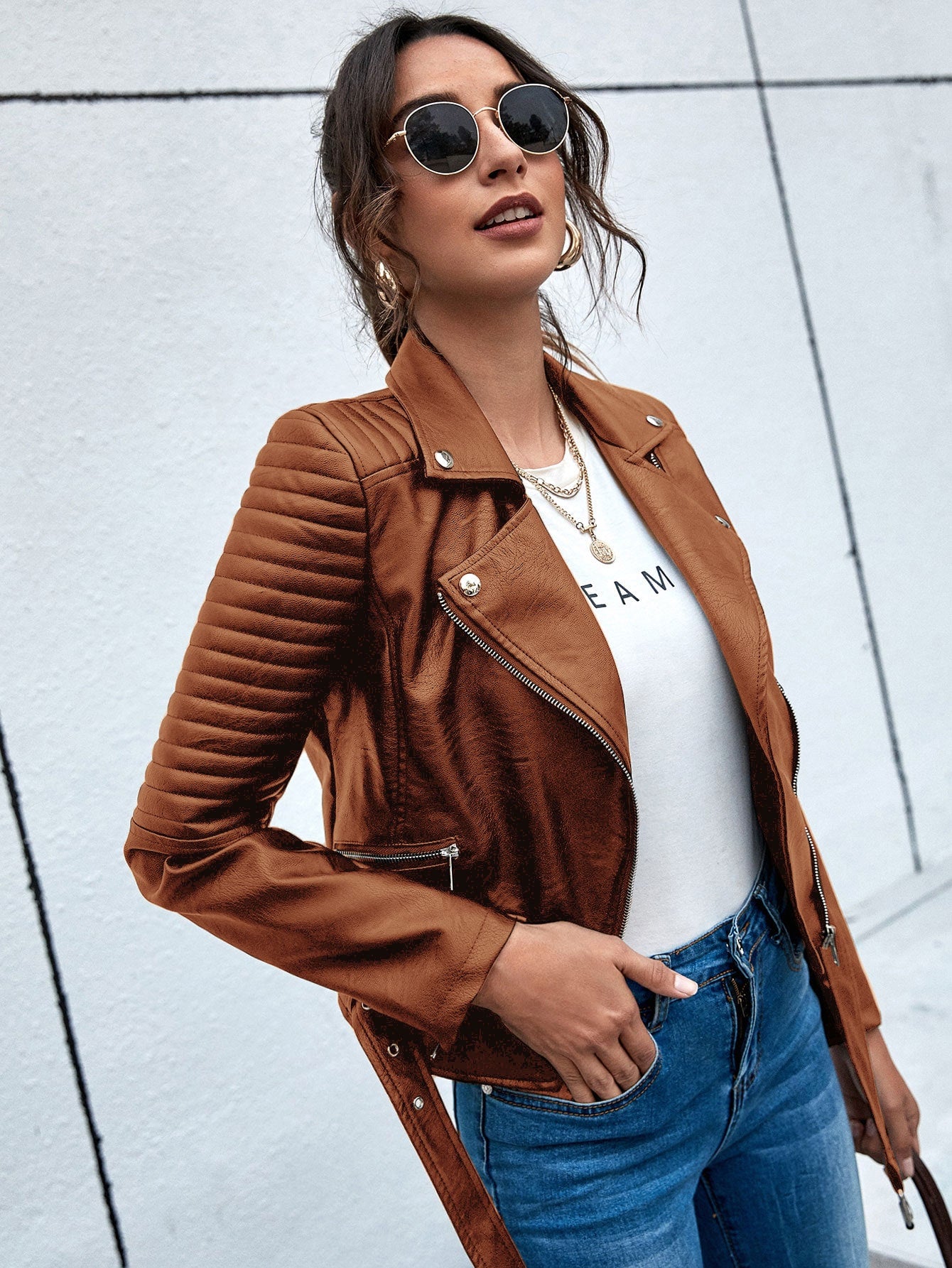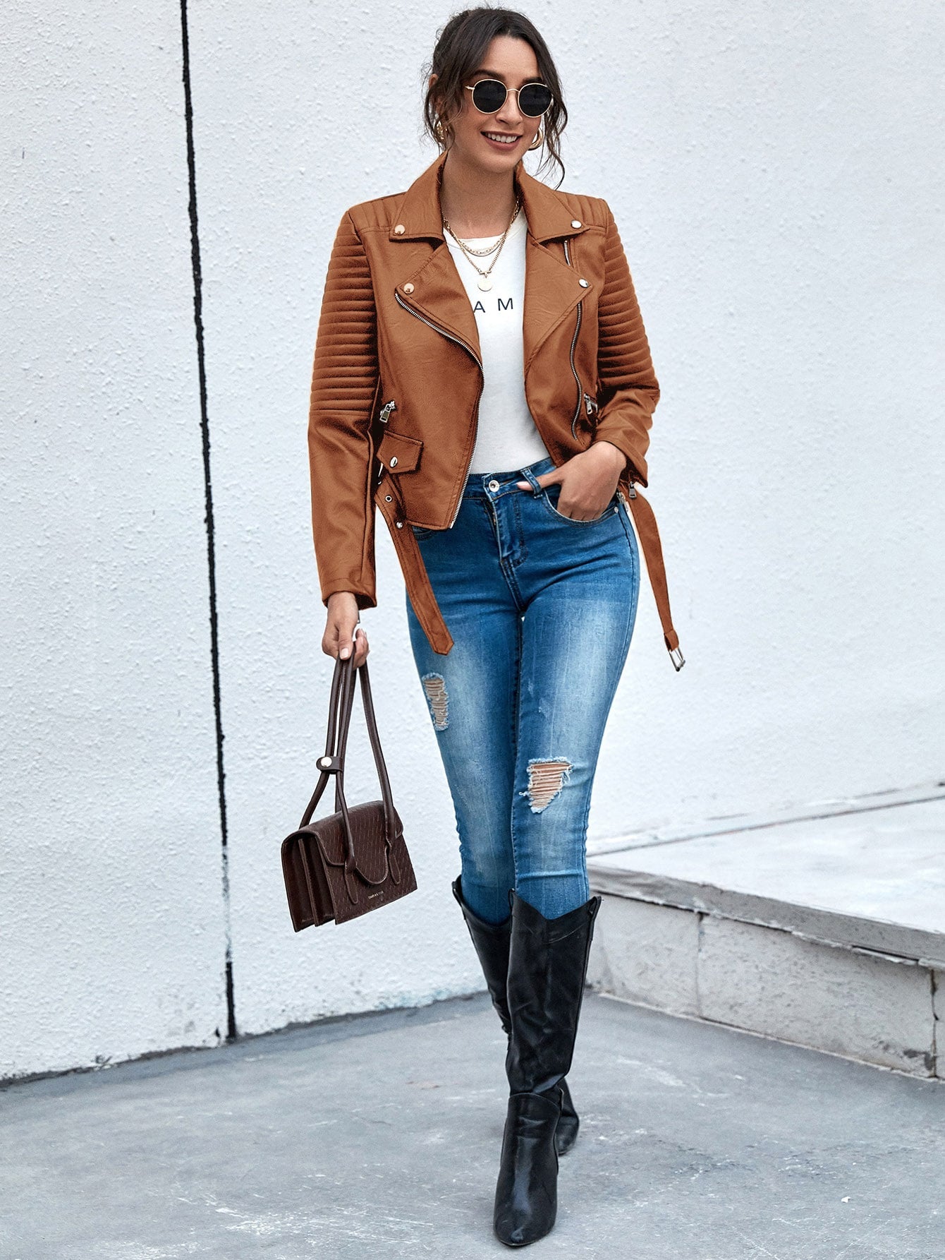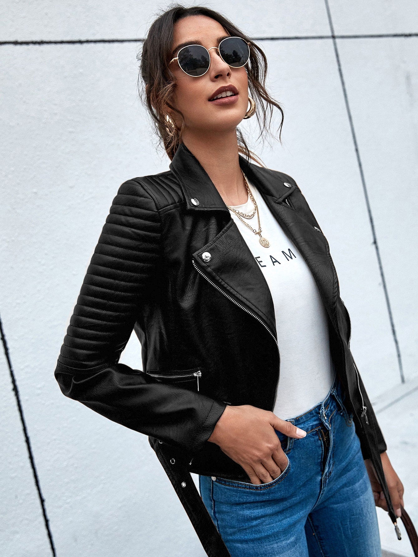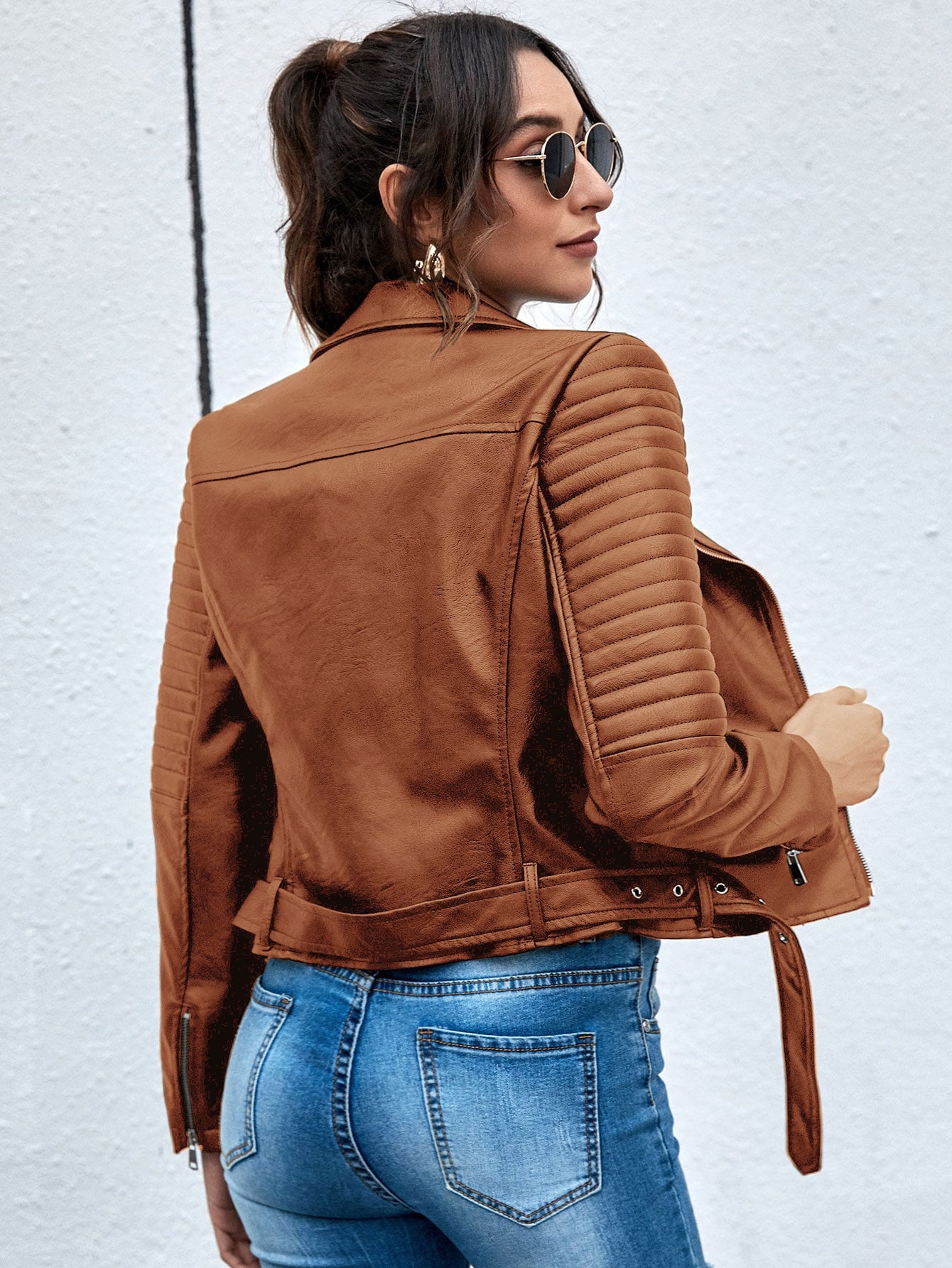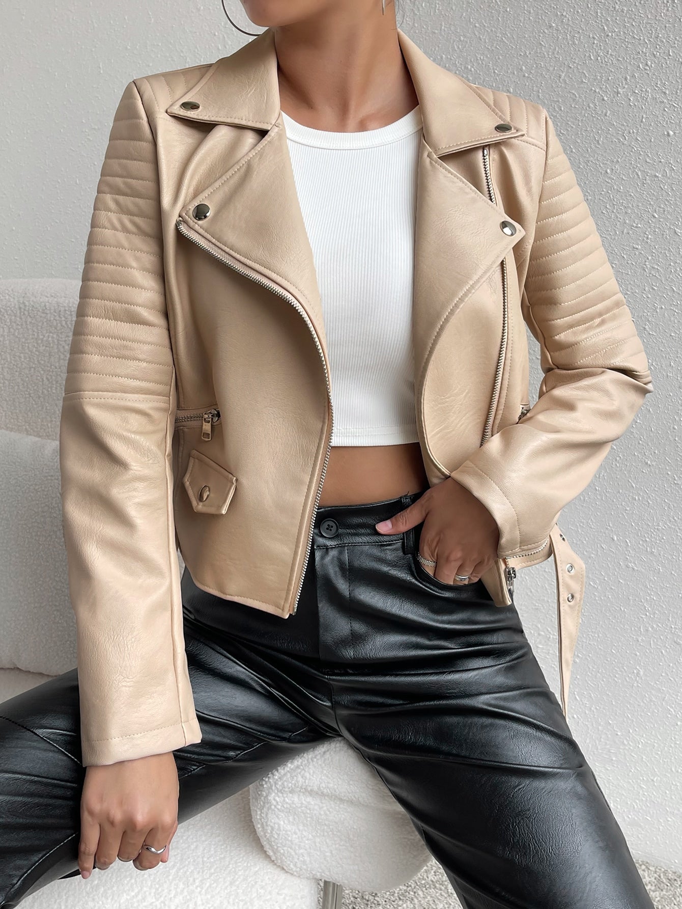 Unity Lapel Collar Belted Zip Up PU Biker Jacket