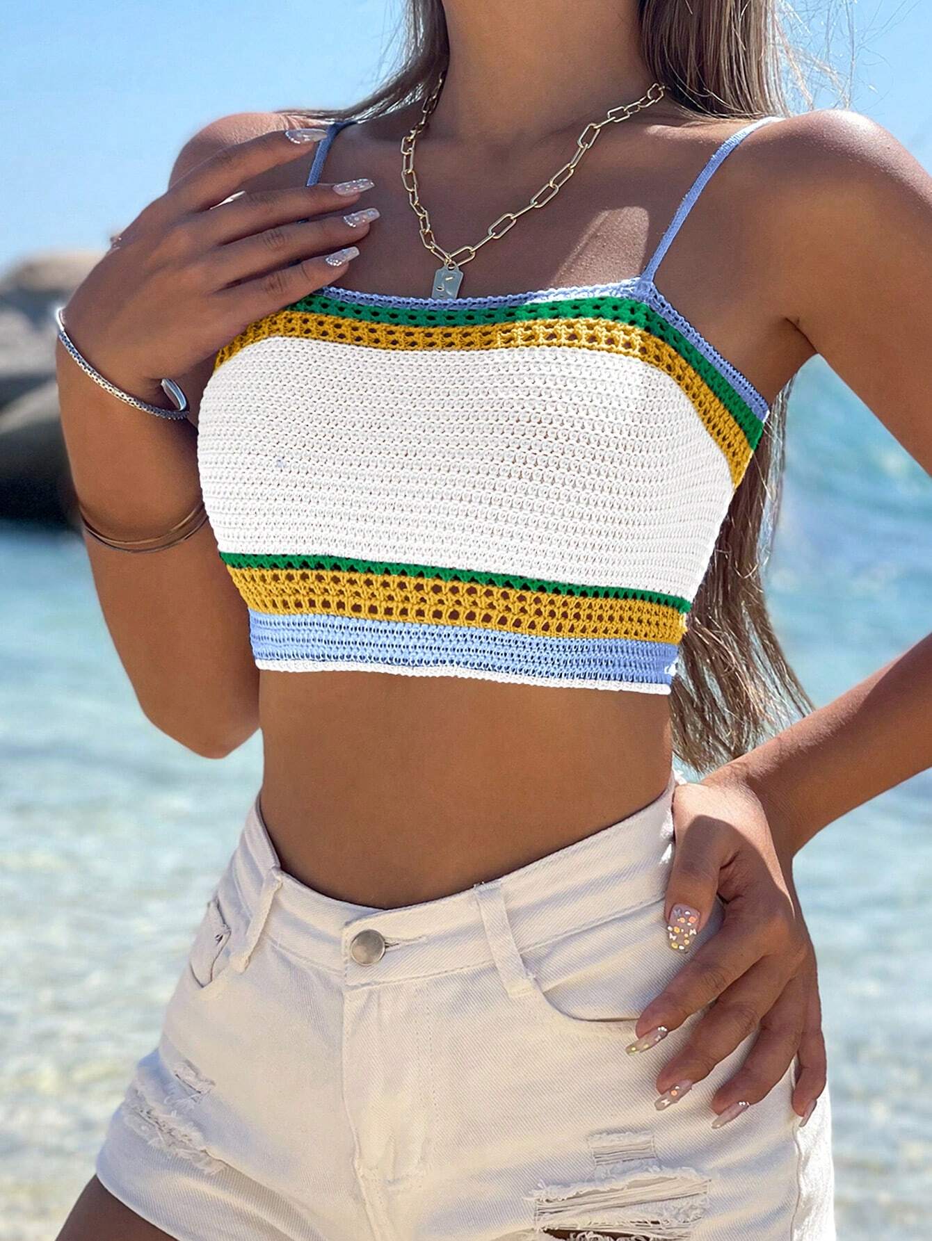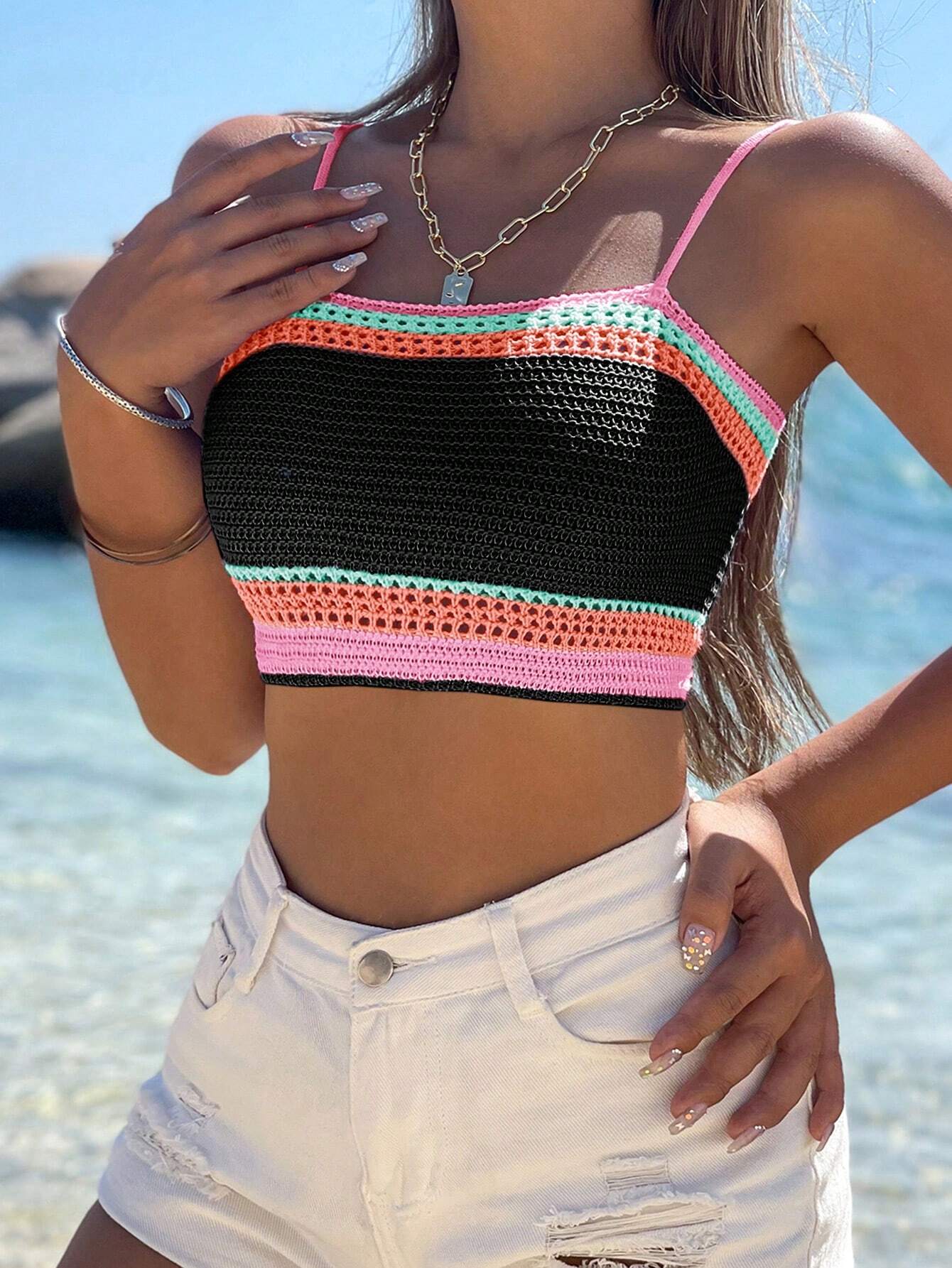VCAY Color Block Cropped Knit Camisole Top