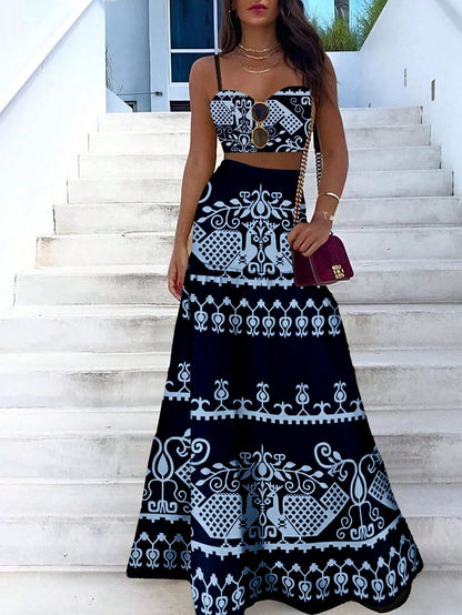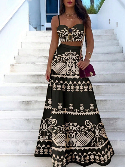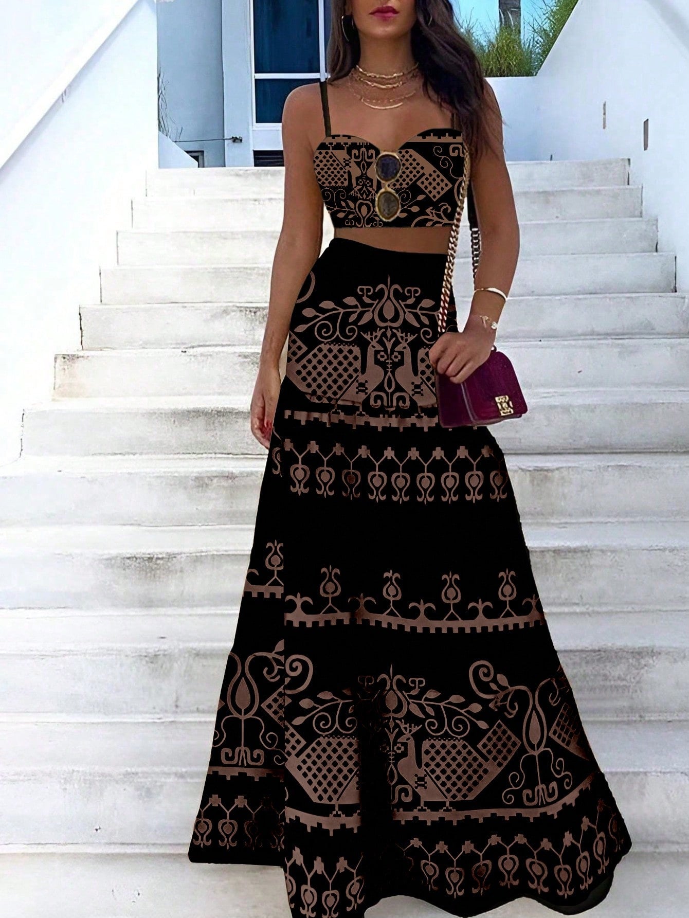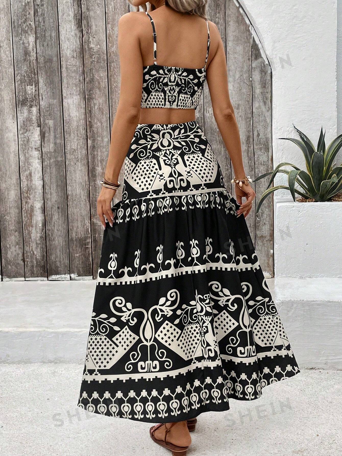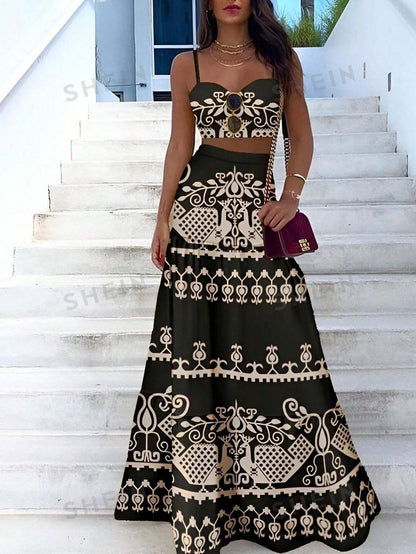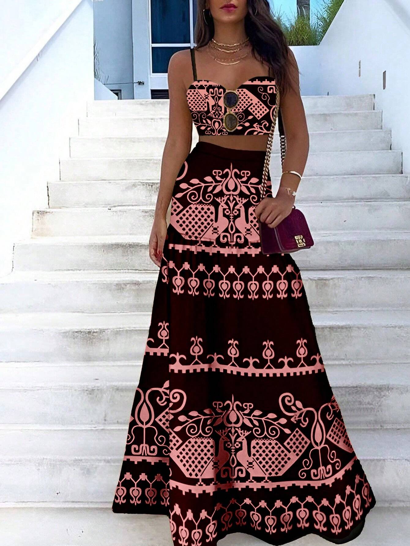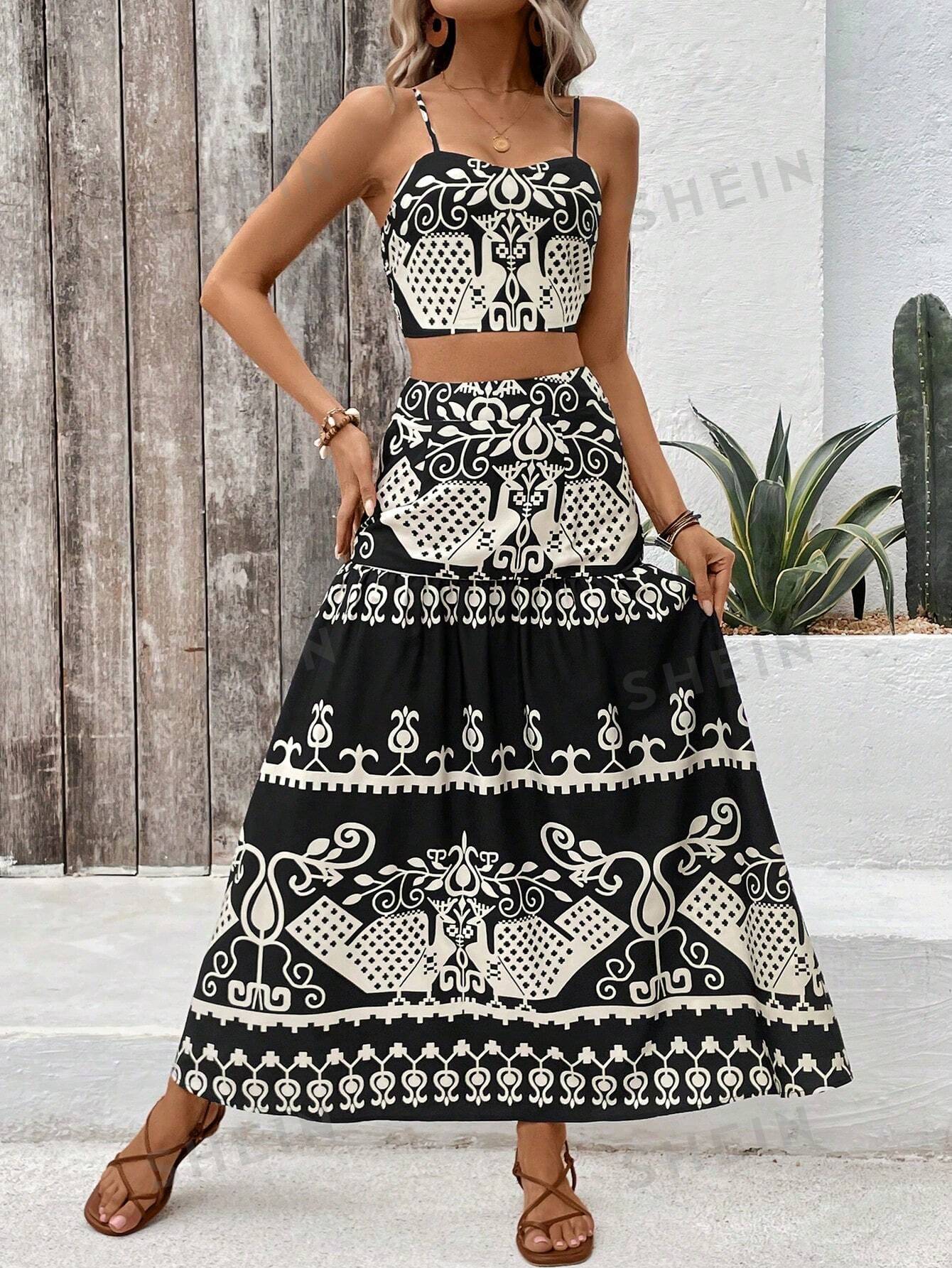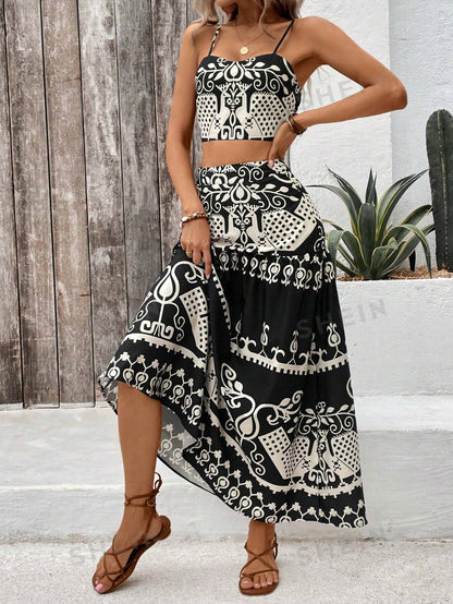 VCAY Vintage Printed Spaghetti Strap Dress Two Pieces Set For Summer Vacation