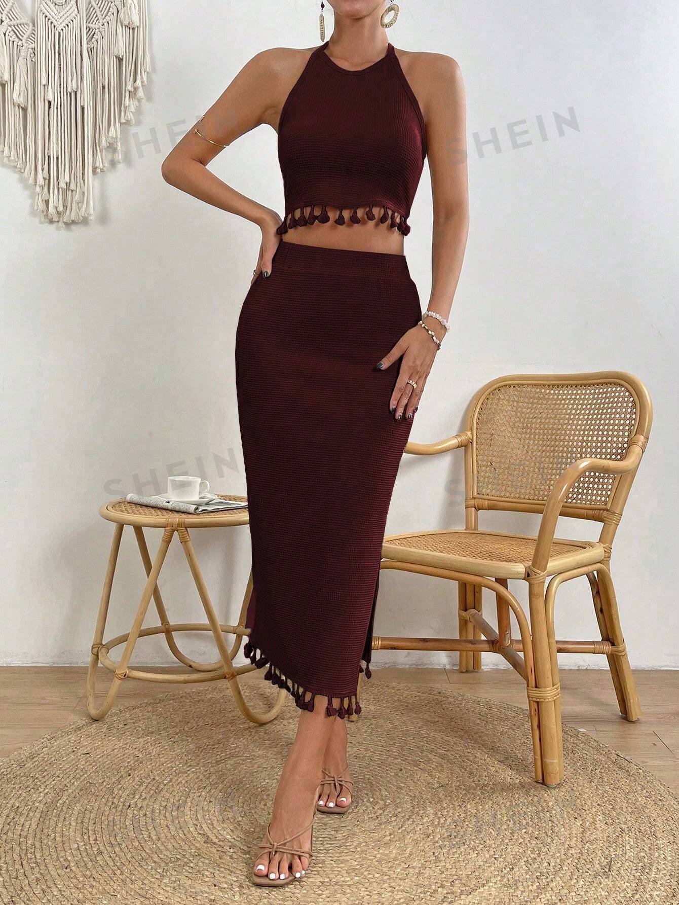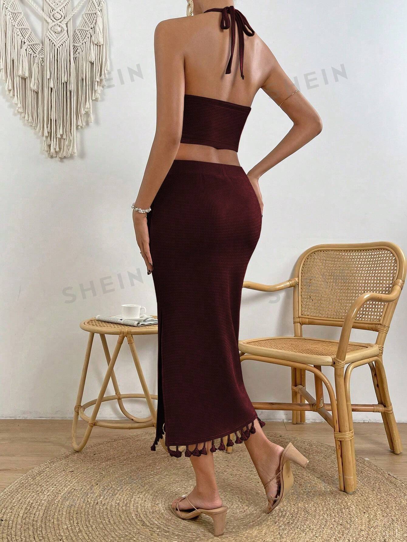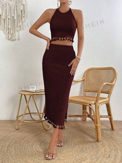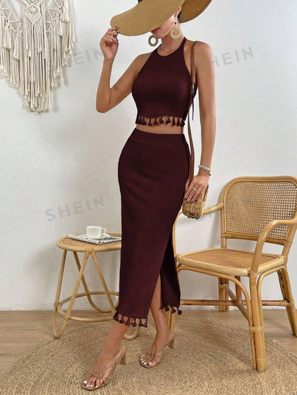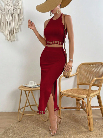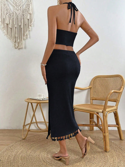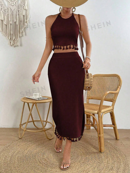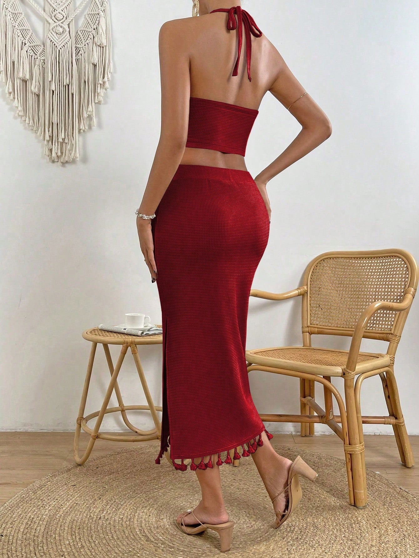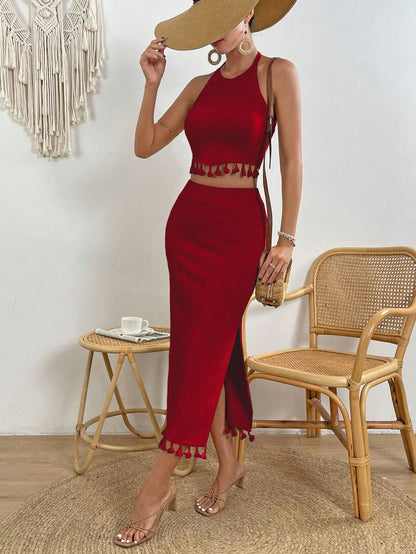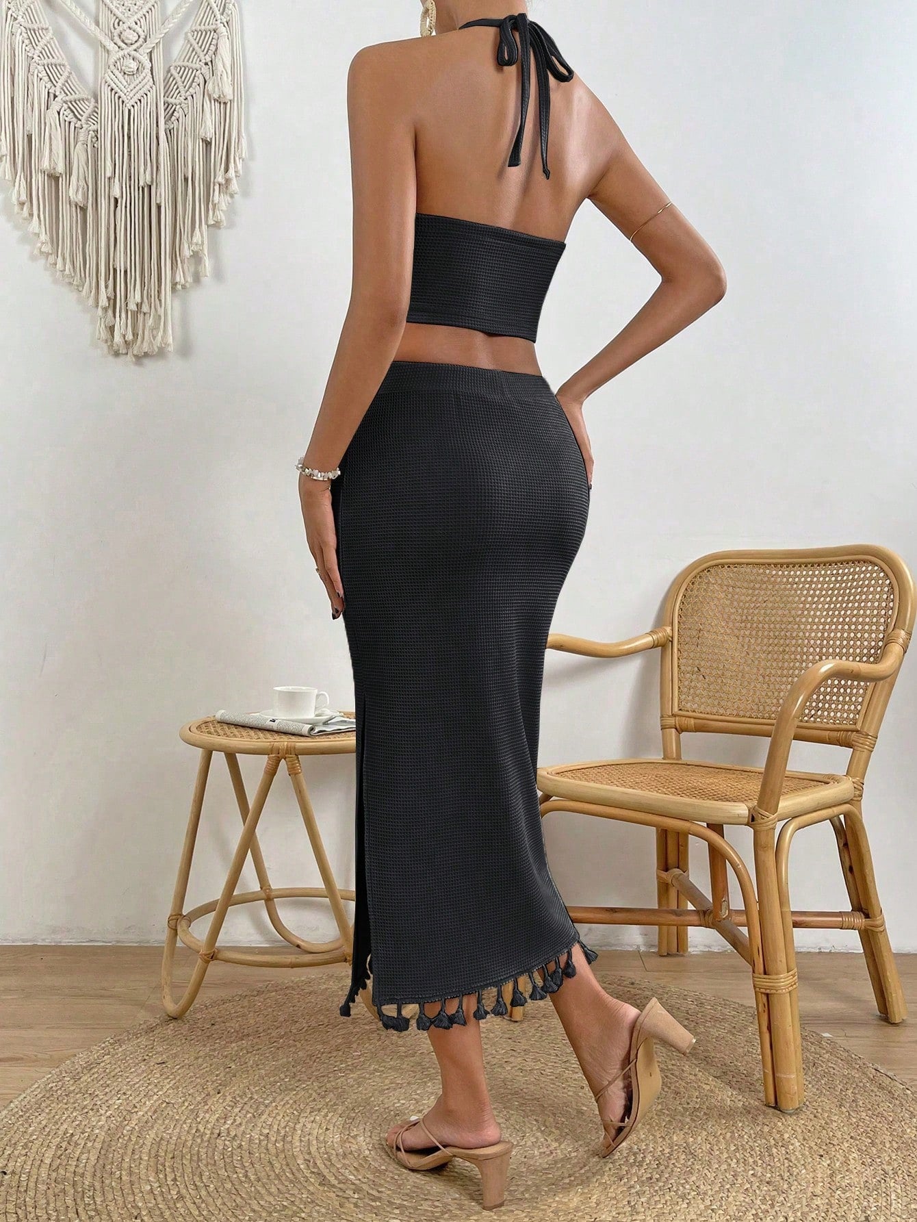VCAY Women's Fringed Halter Top And High Slit Skirt Set