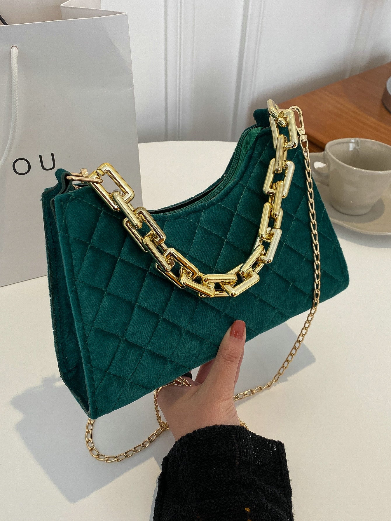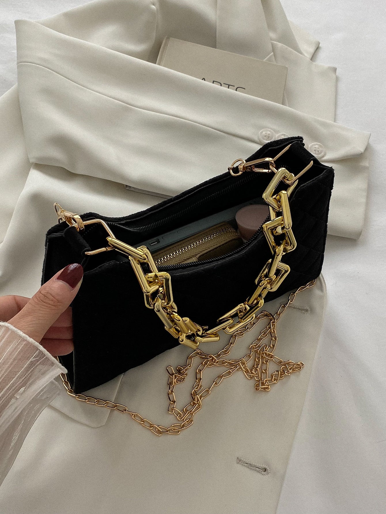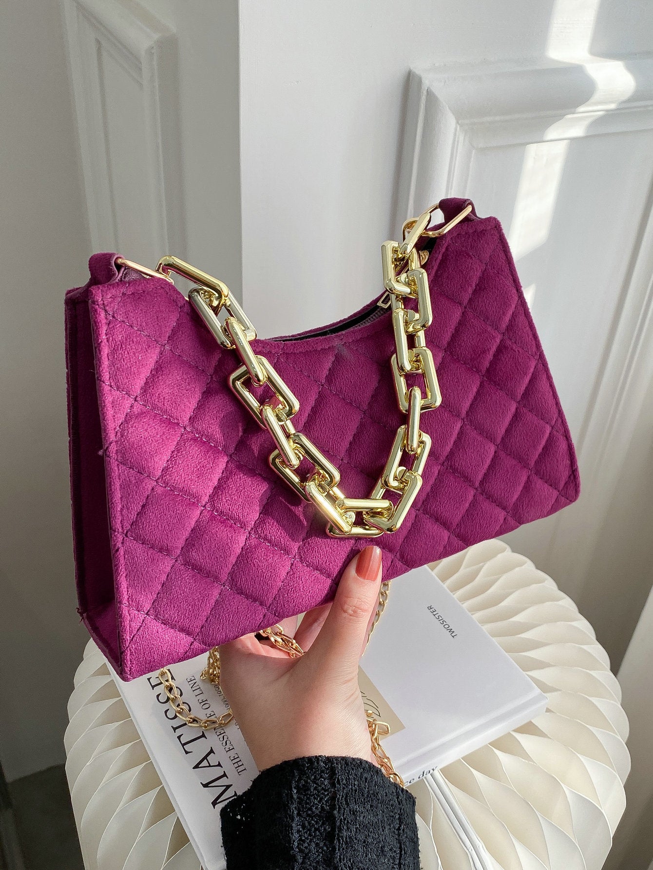 Velvet Quilted Chain Baguette Bag
