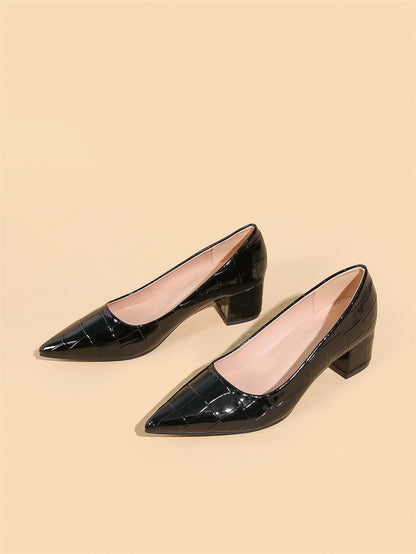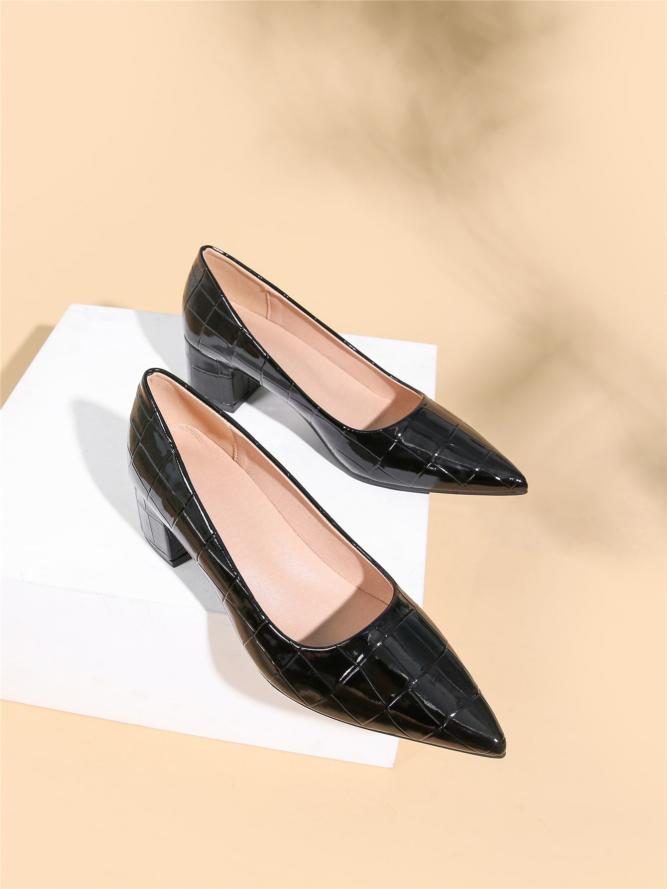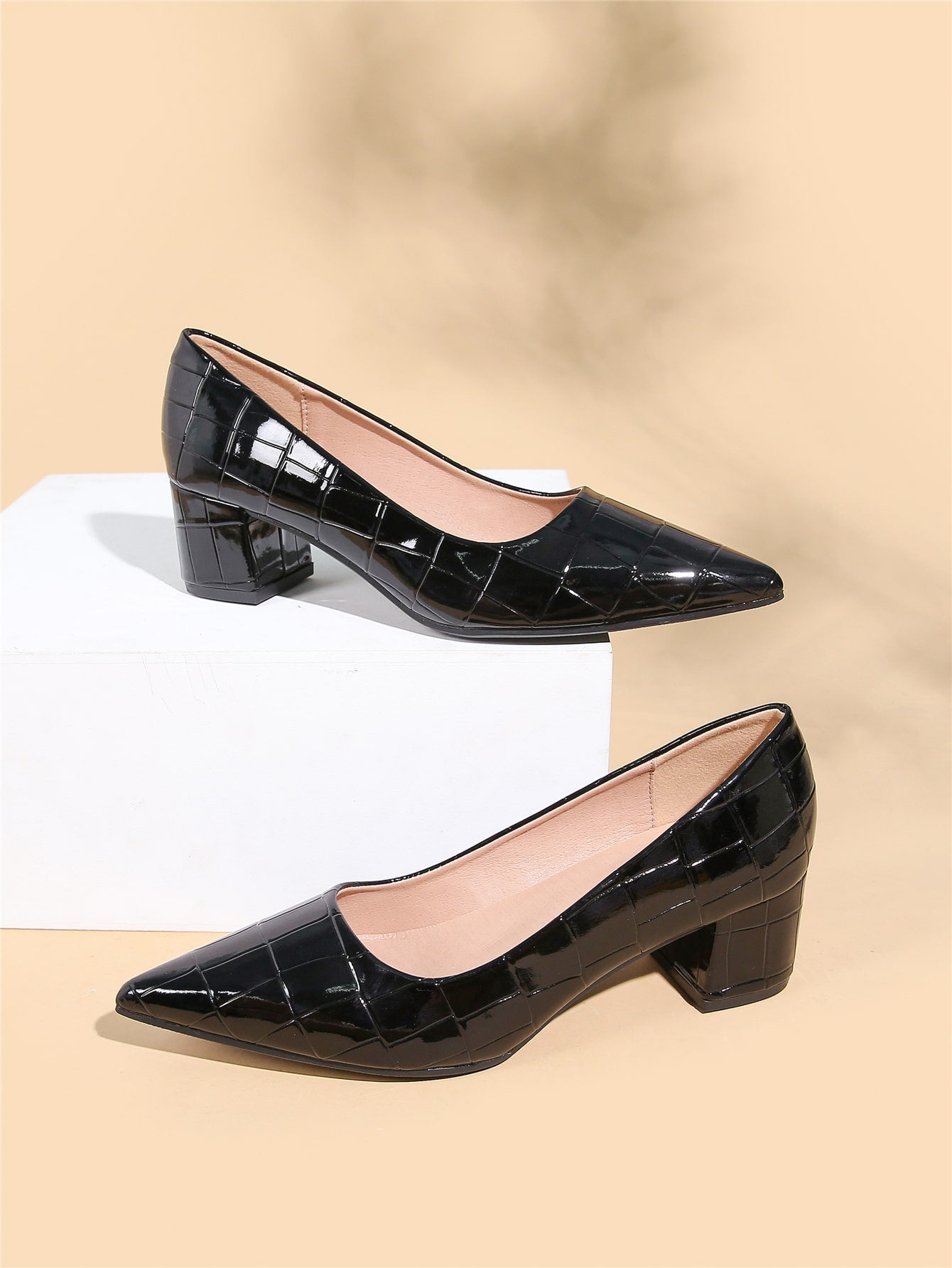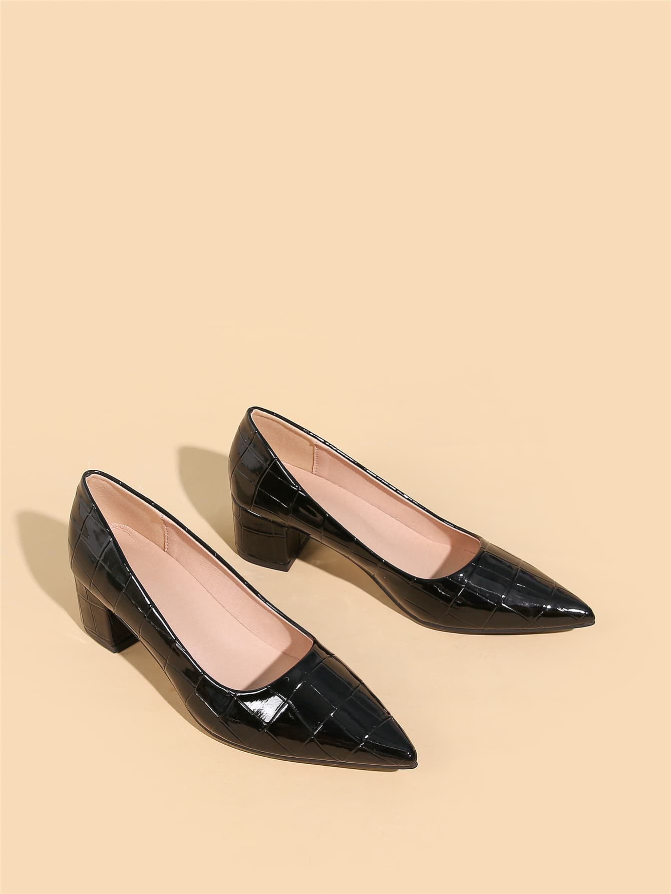 Women Black Crocodile Embossed Pumps, Chunky Heeled Court Pumps