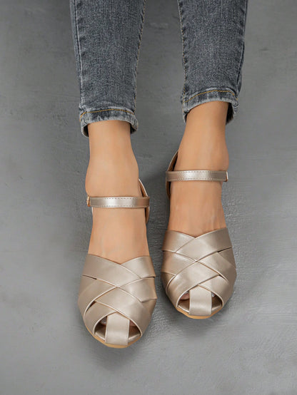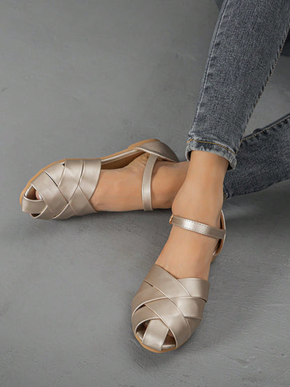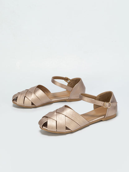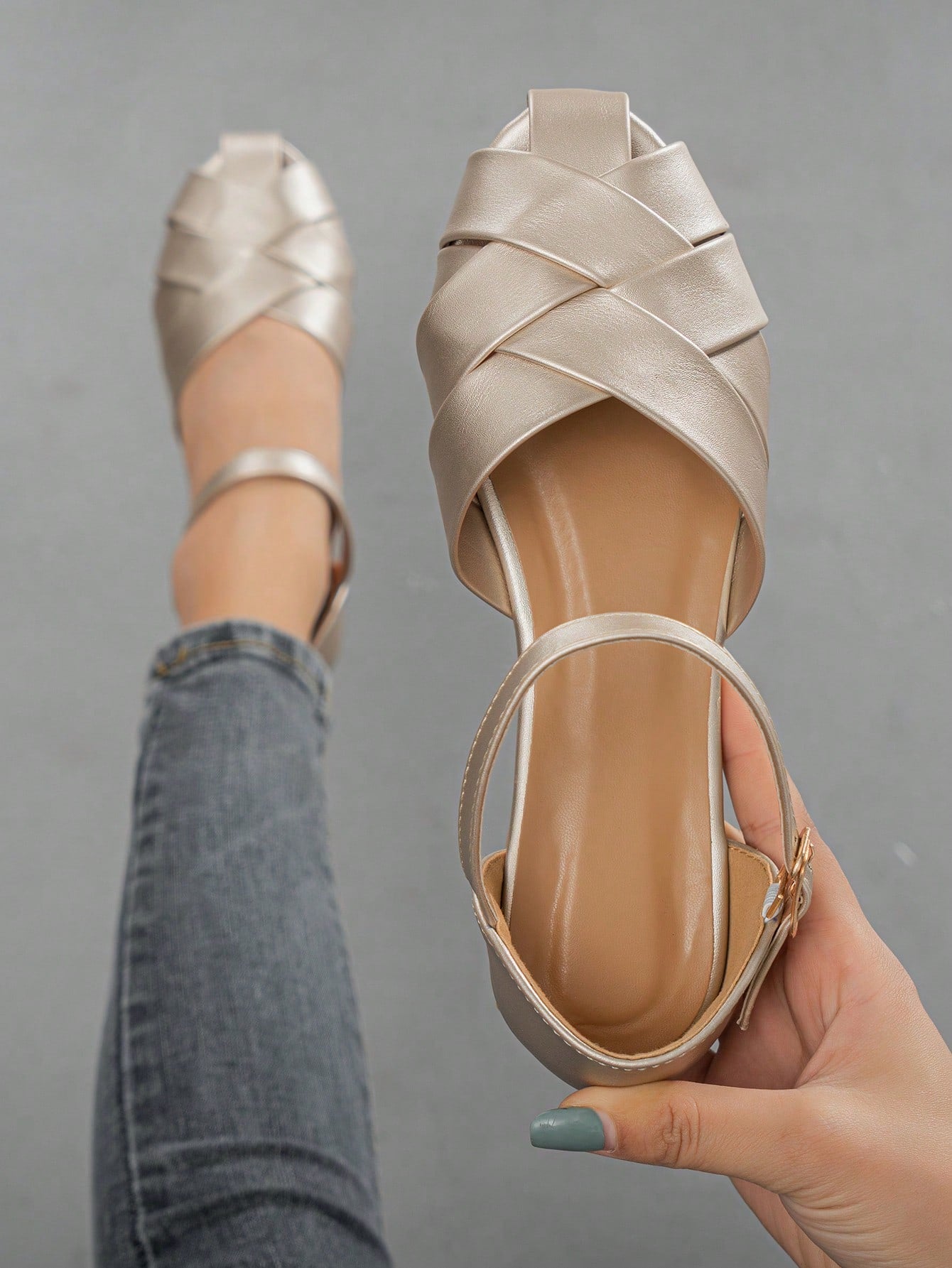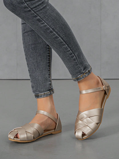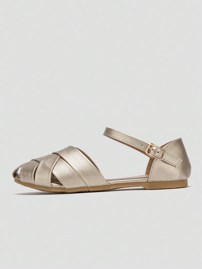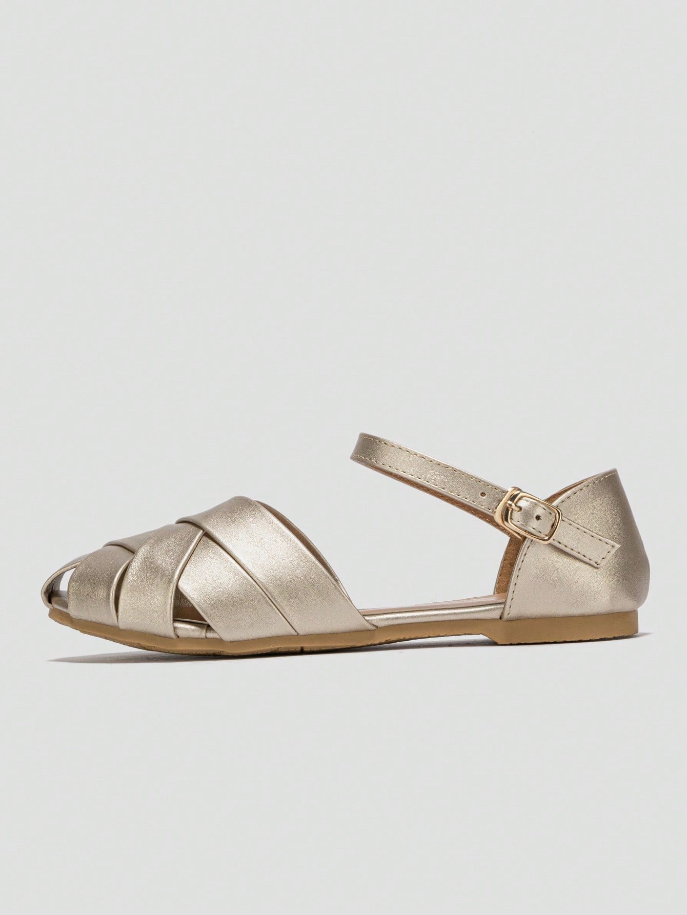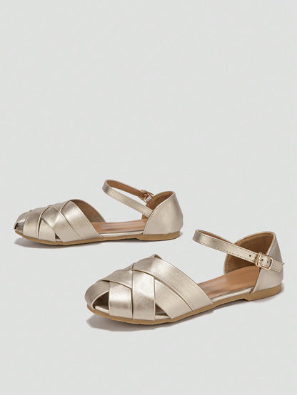 Women Metallic Braided Detail Flat Sandals, Glamorous Gold Ankle Strap Sandals