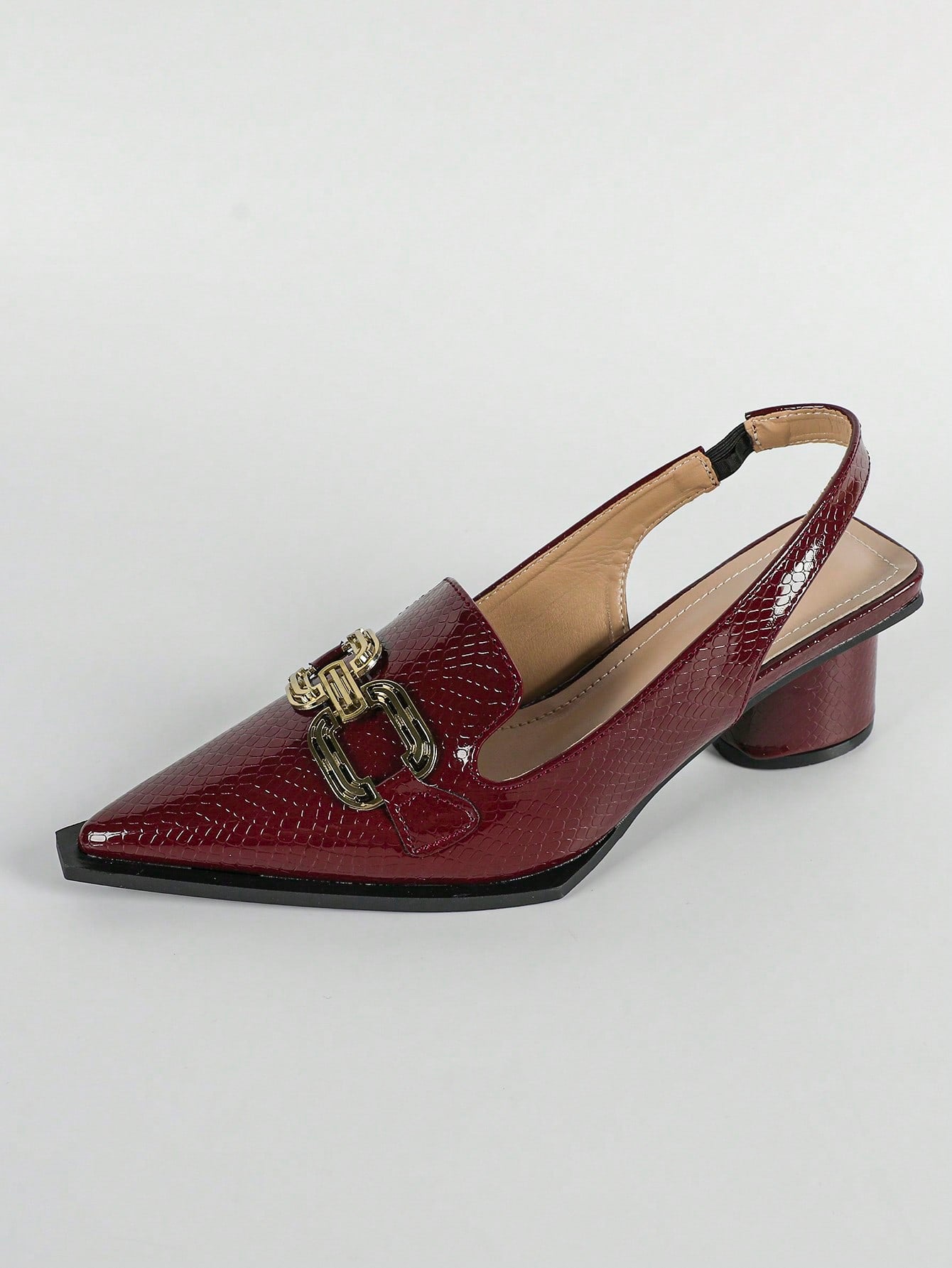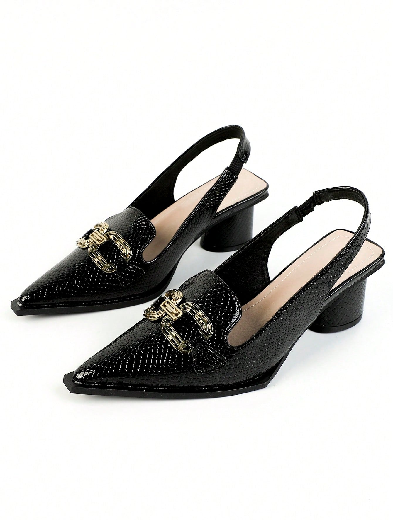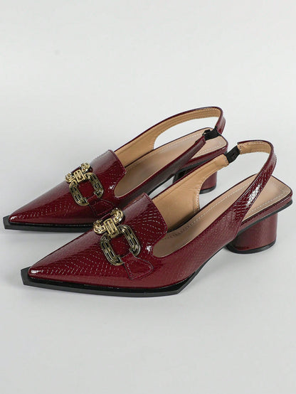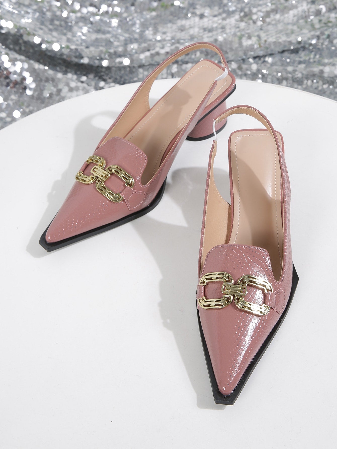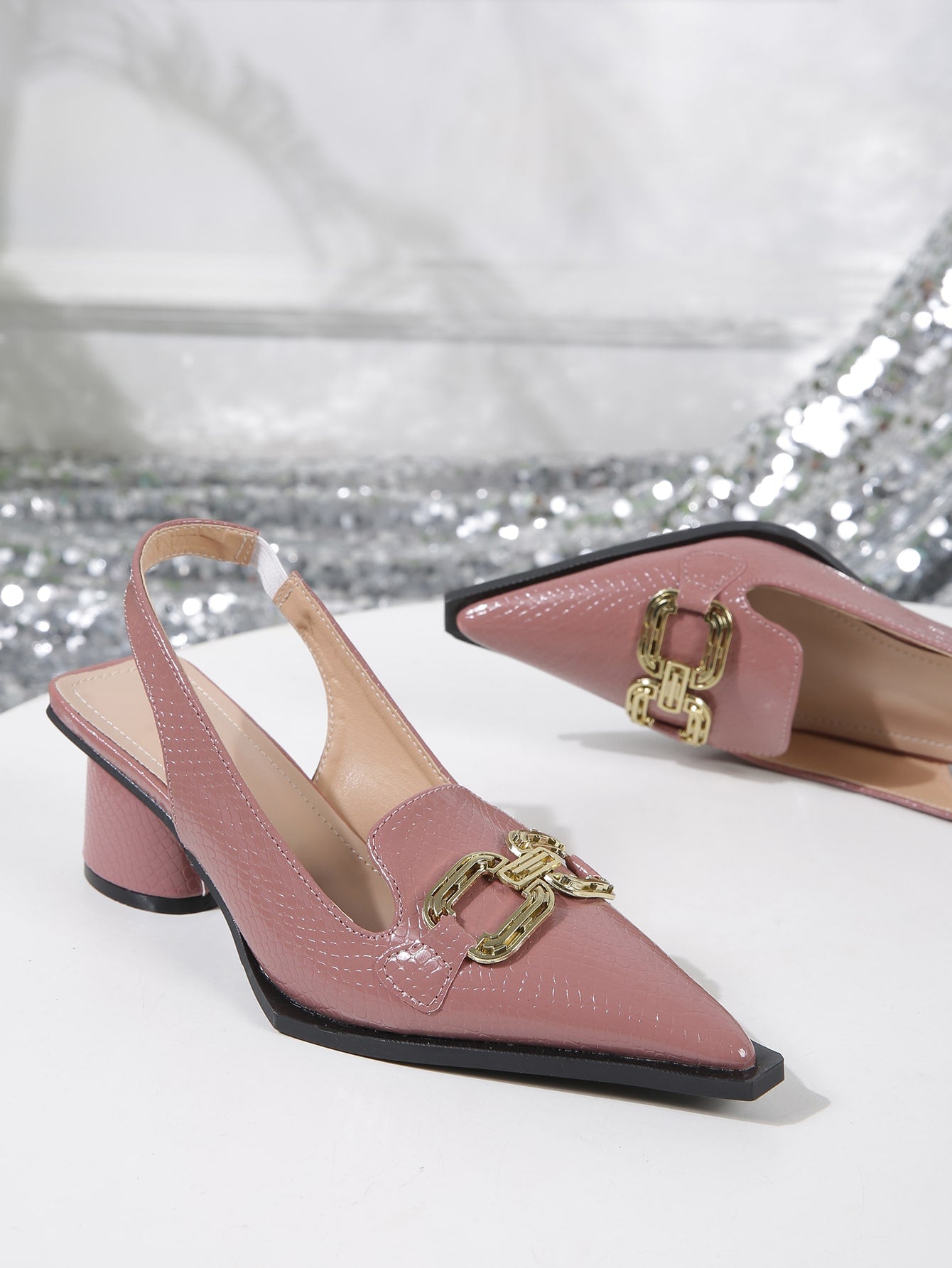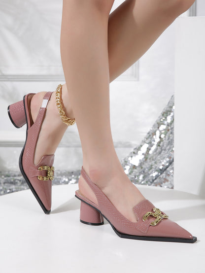 Women Snakeskin Embossed Metal Decor Pumps, Point Toe Slingback Sculptural Heeled Fashionable Pumps Pink