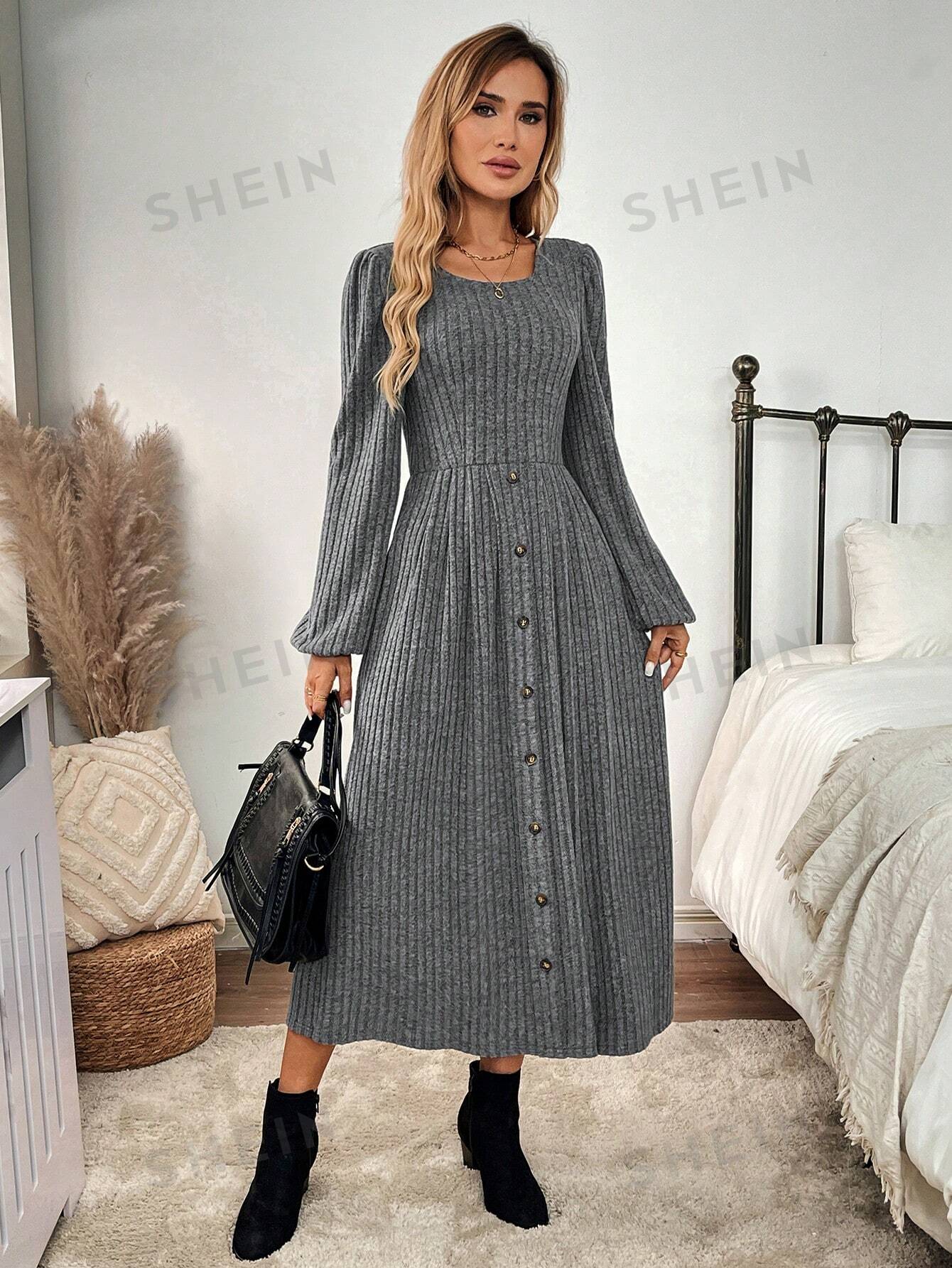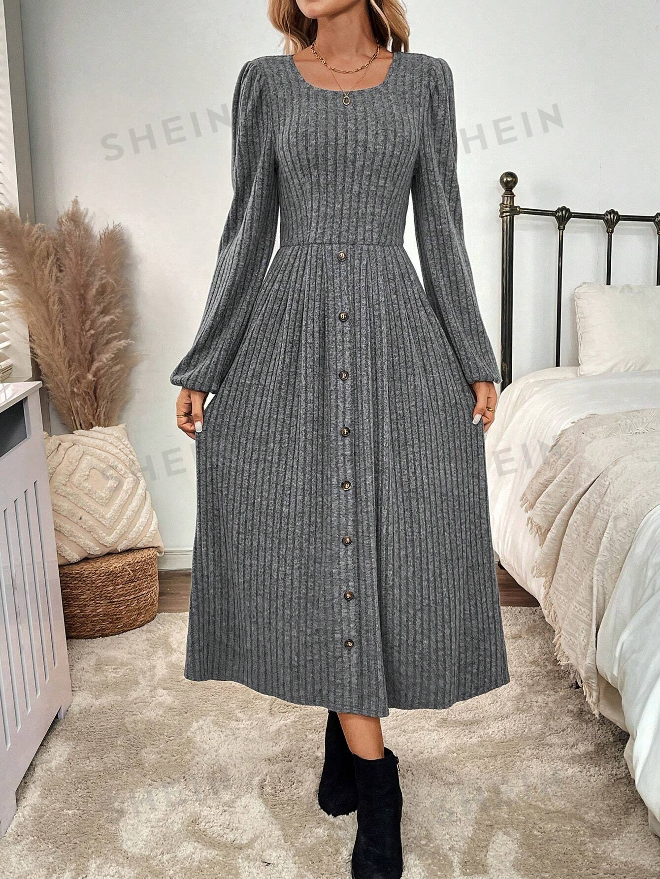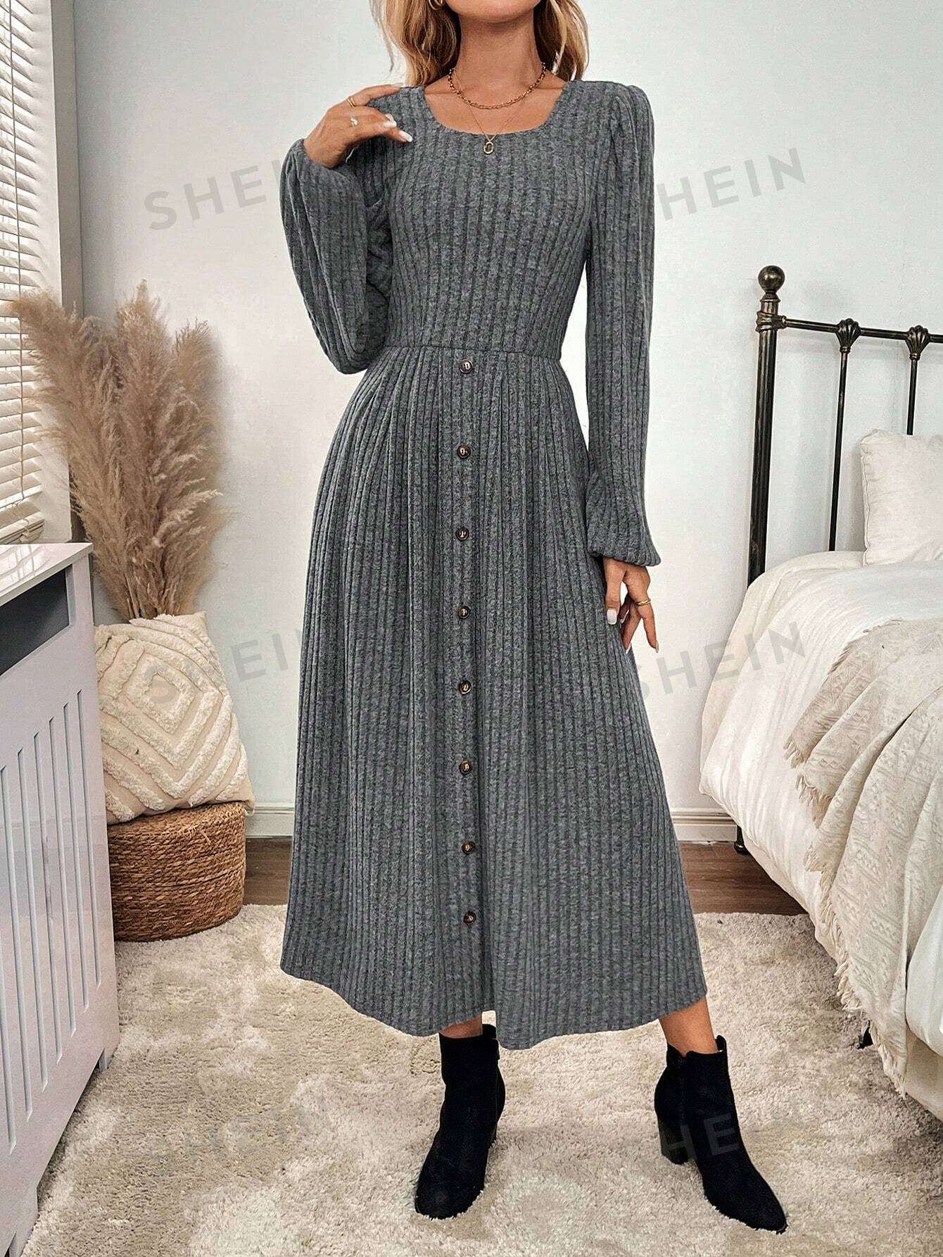 Women's Solid Color Front Button A-Line Dress Fall Women Clothes