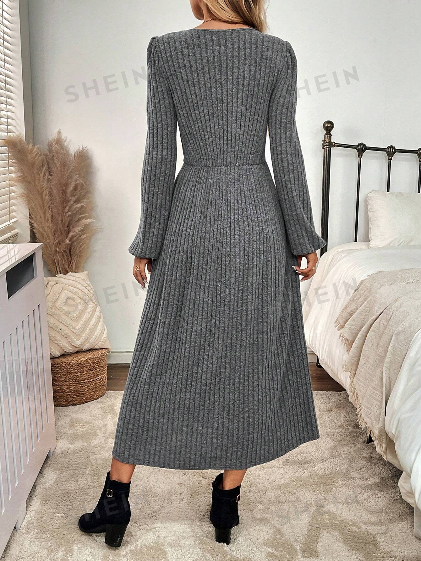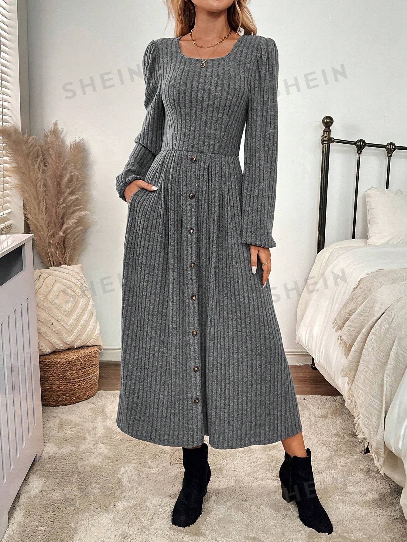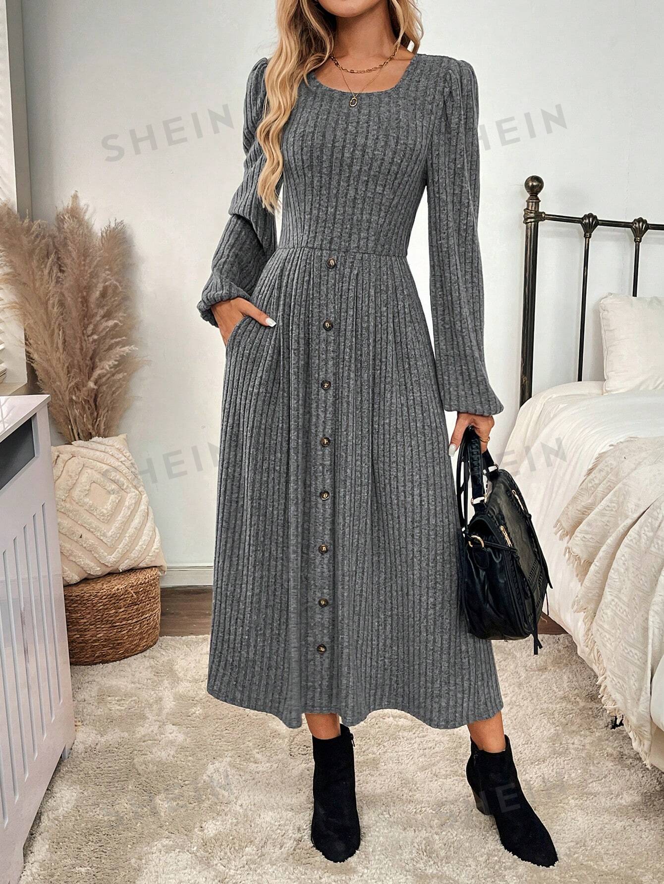 Women's Solid Color Front Button A-Line Dress Fall Women Clothes