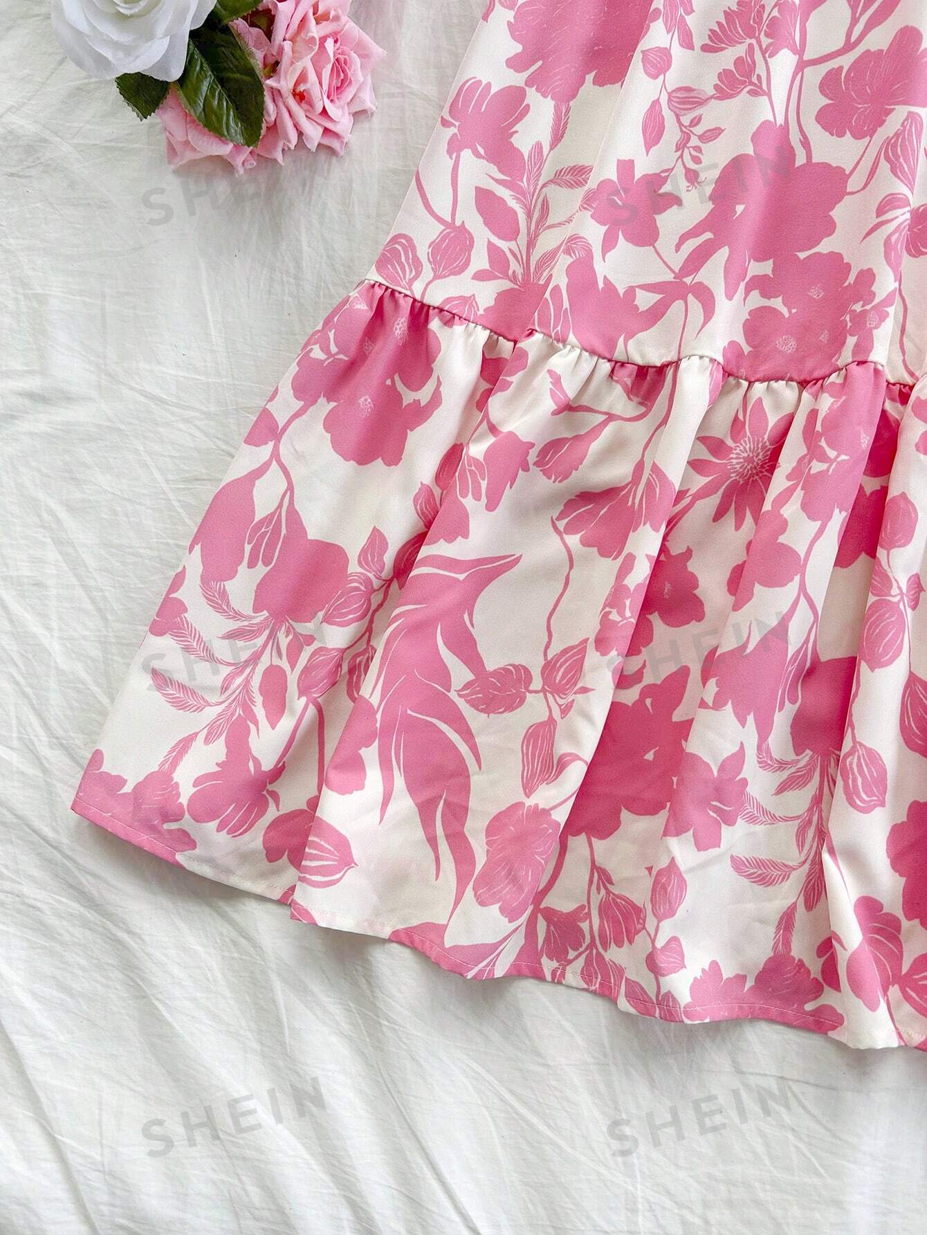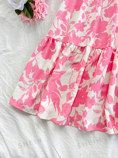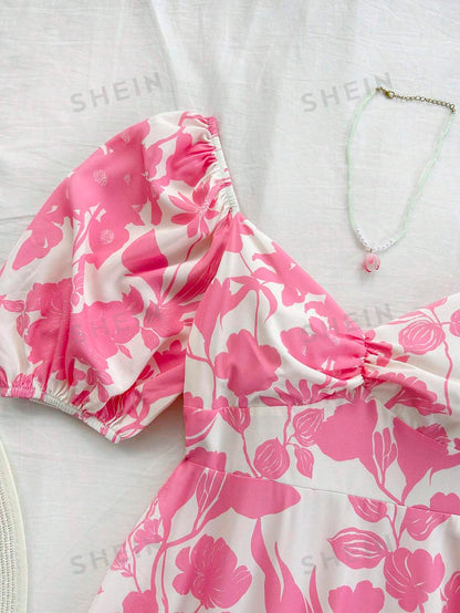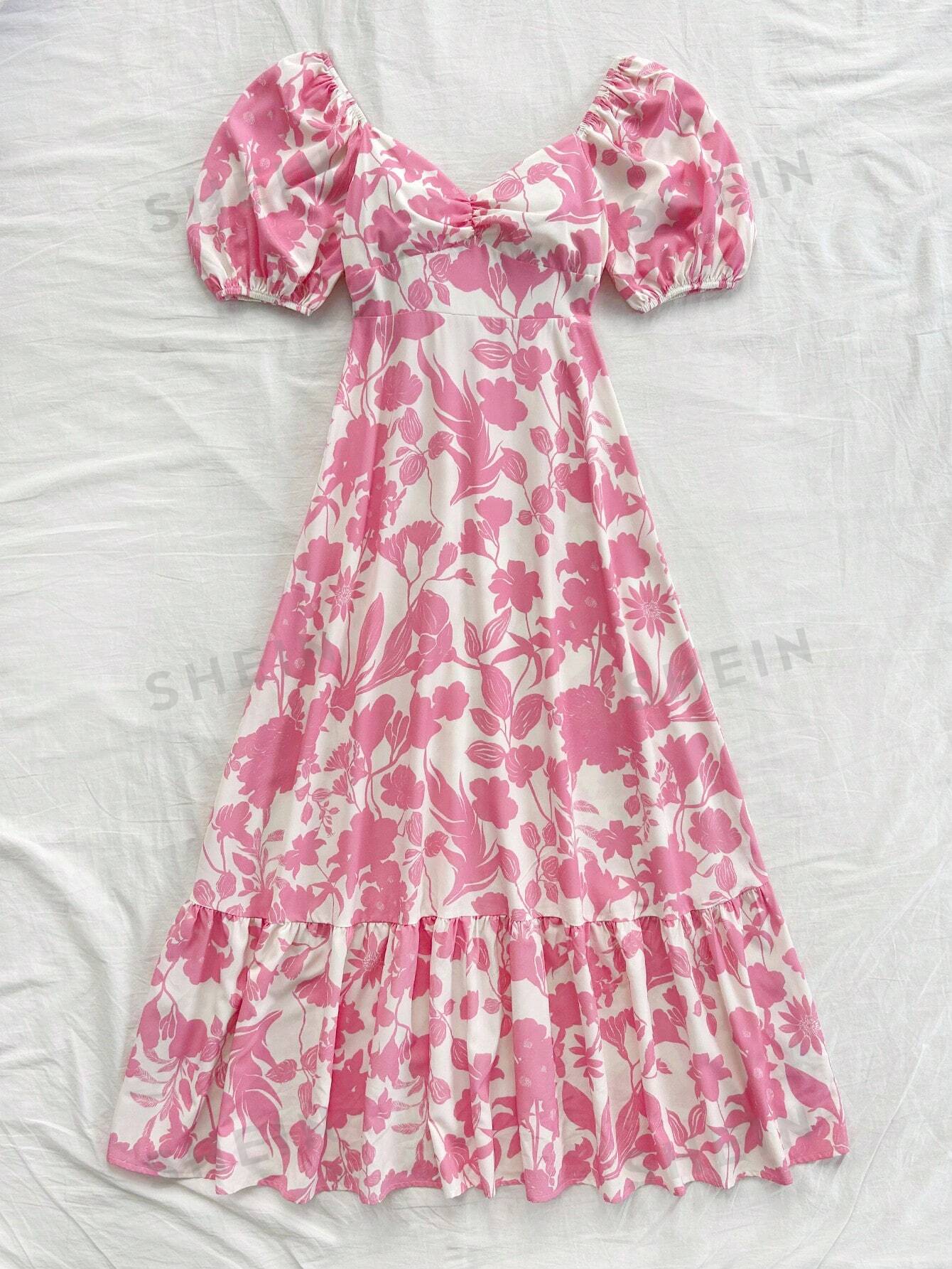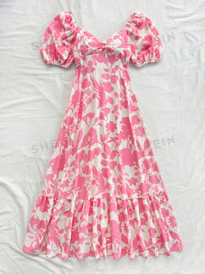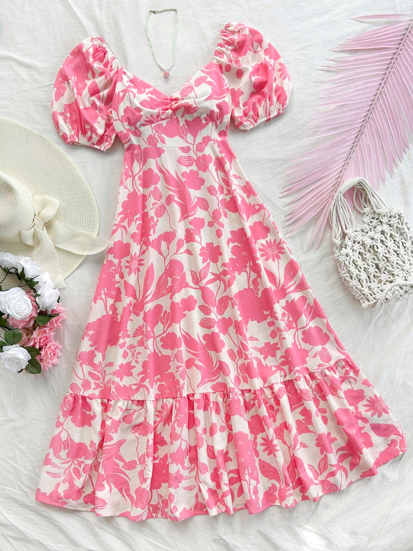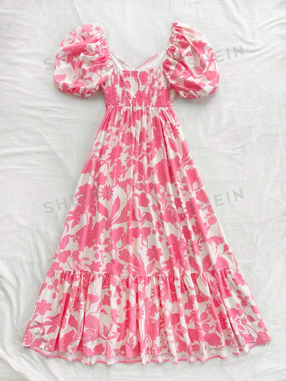 Women's Vacation Print Dual-Tone Silhouette Puff Sleeve Ruffled Hem Casual Dress