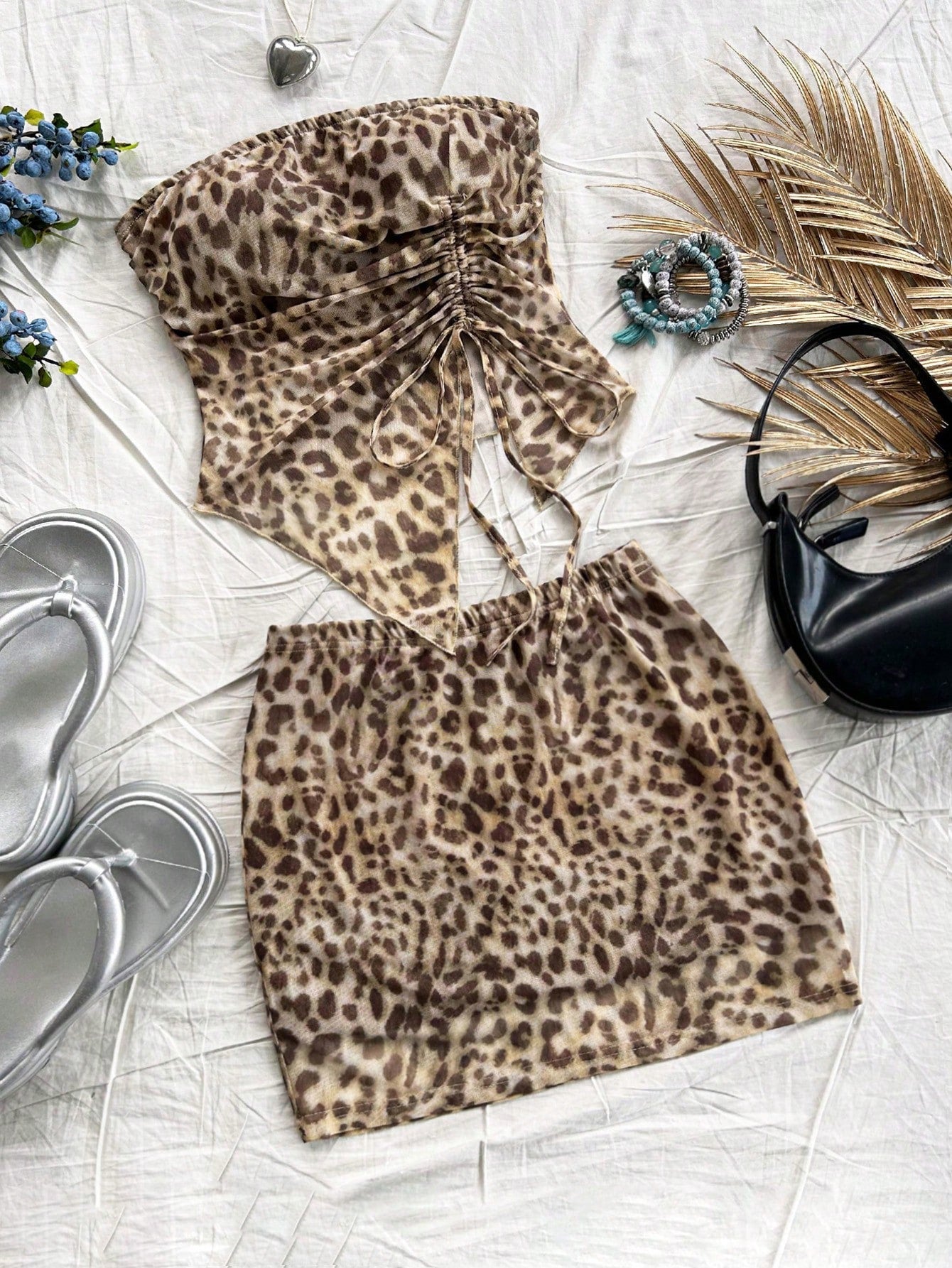 WYWH Women Blue Floral Print Drawstring Bandeau Top And Ruched Skirt 2 Piece Set For Beach Resort