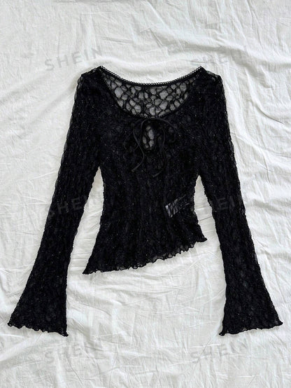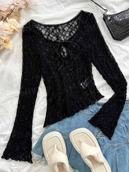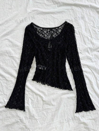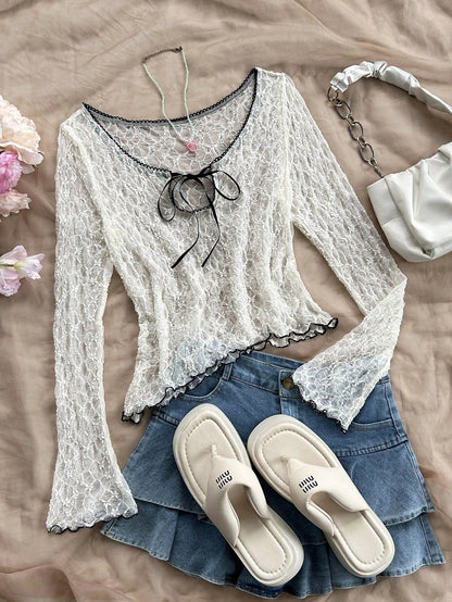WYWH WYWH Women Vacation Faux 2-In-1 Round Neck Long Sleeve T-Shirt, Maroon Contrast Cable Knit Long Sleeve Pullover